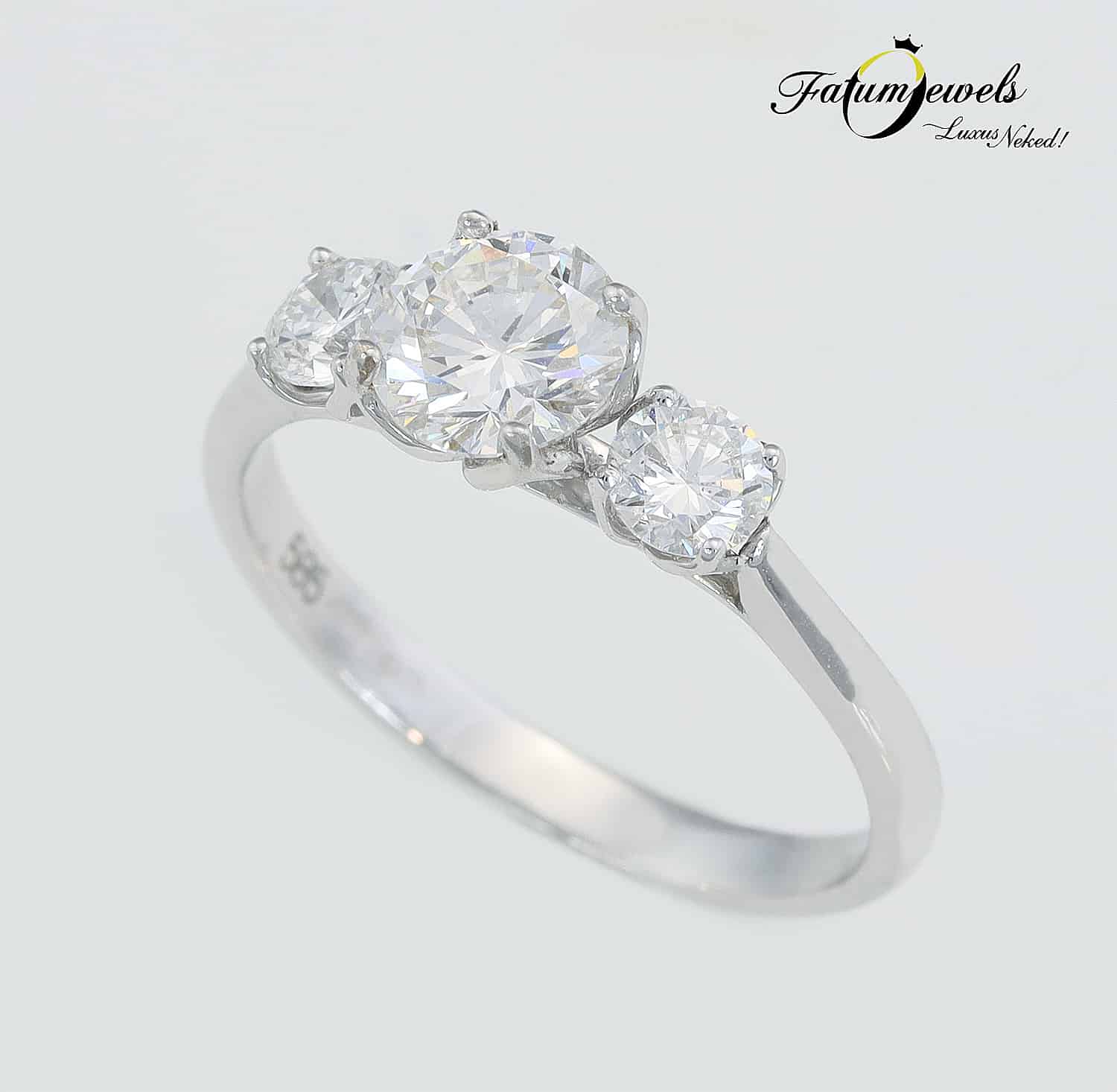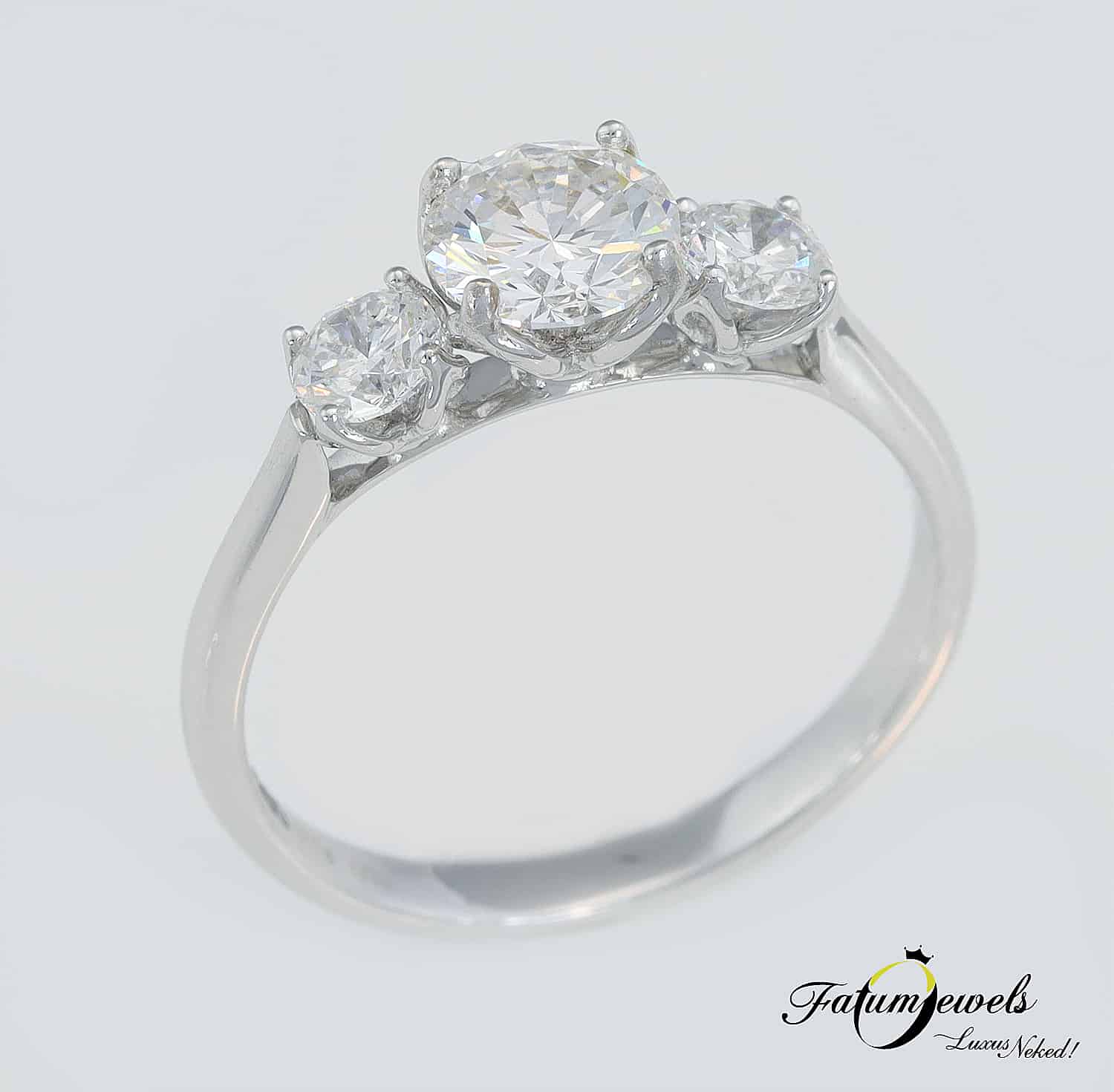 A háromköves eljegyzési gyűrű a hagyományos és a modern eljegyzési gyűrű között helyezkedik el félúton. Tökéletes választás azok számára, akiket egyformán vonz a hagyományos és a modern érzés. Ez a Fatumjewels egyedi gyémántgyűrű különleges gyémántokat kapott, melyek össztömege meghaladja az egy karátot. A központi gyémánt kiváló minőségét HRD tanúsítvány igazolja. Itt az alkalom, hogy igazán különleges ékszerrel kérd meg kedvesed kezét.