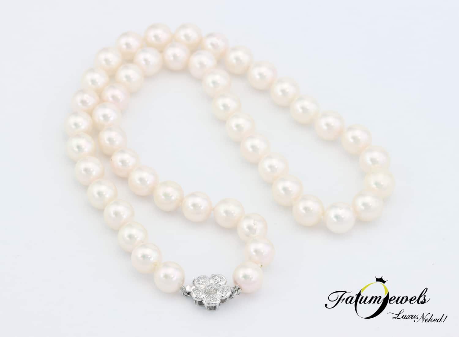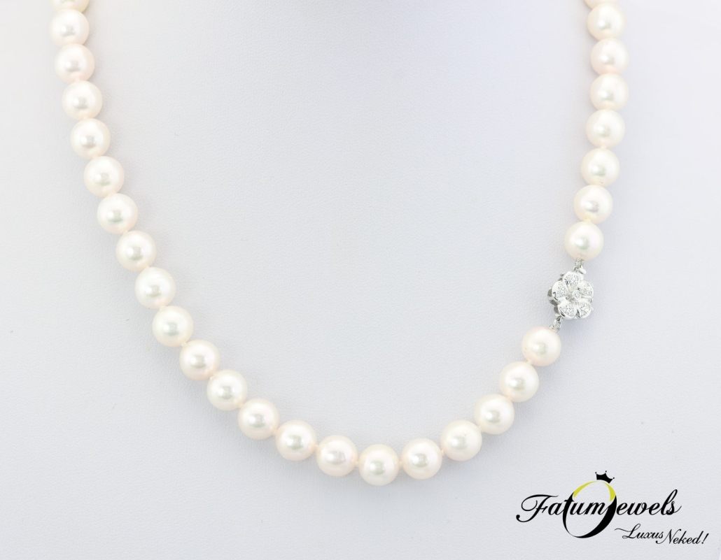 Tradicionális fehér gyöngy gyöngysor fehérarany gyémántokkal díszített kapoccsal, mindez sósvízi akoya gyöngyből a Fatumjewels Galéria gyöngysor kínálatában. 44,5 cm hosszú nyaklánc, mely 47 szem fehér akoya gyöngyből áll. Az elegancia nem mindig olyan luxus, melyet nem engedhetsz meg magadnak. Ez a fehér gyöngysor hozzáférhető, roppant elegánssá teszi majd megjelenésedet.