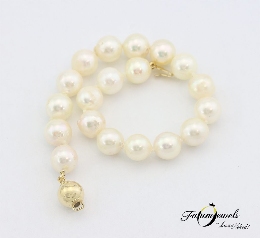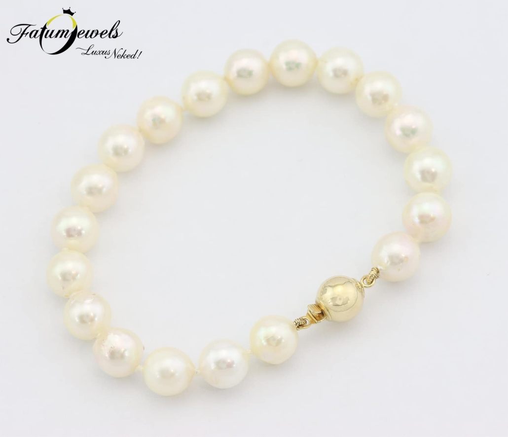 Ajándékozz természetes szépséget a Fatumjewels Galériából! A fehér színű gyöngy karkötő romantikus, kedves látványt nyújt. A 8,1- 8,4 mm átmérőjű akoya gyöngy karkötő sárga arany kapcsot kapott, mely által bármilyen sárga arany kapcsos gyöngysorhoz jól illeszkedik. A karkötőt szemenként kézzel csomózták a hozzá értő kezek. Fatumjewels gyöngy karkötő a romantika jegyében.