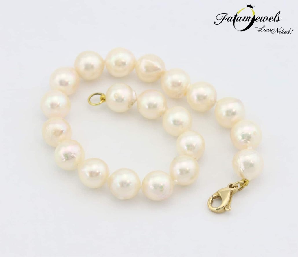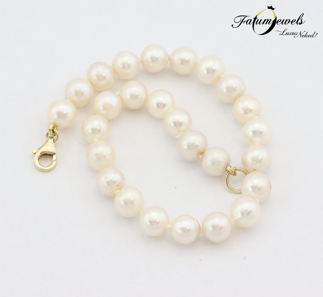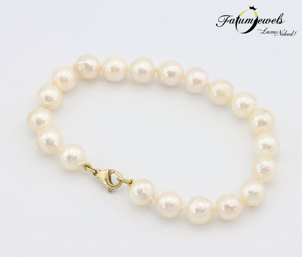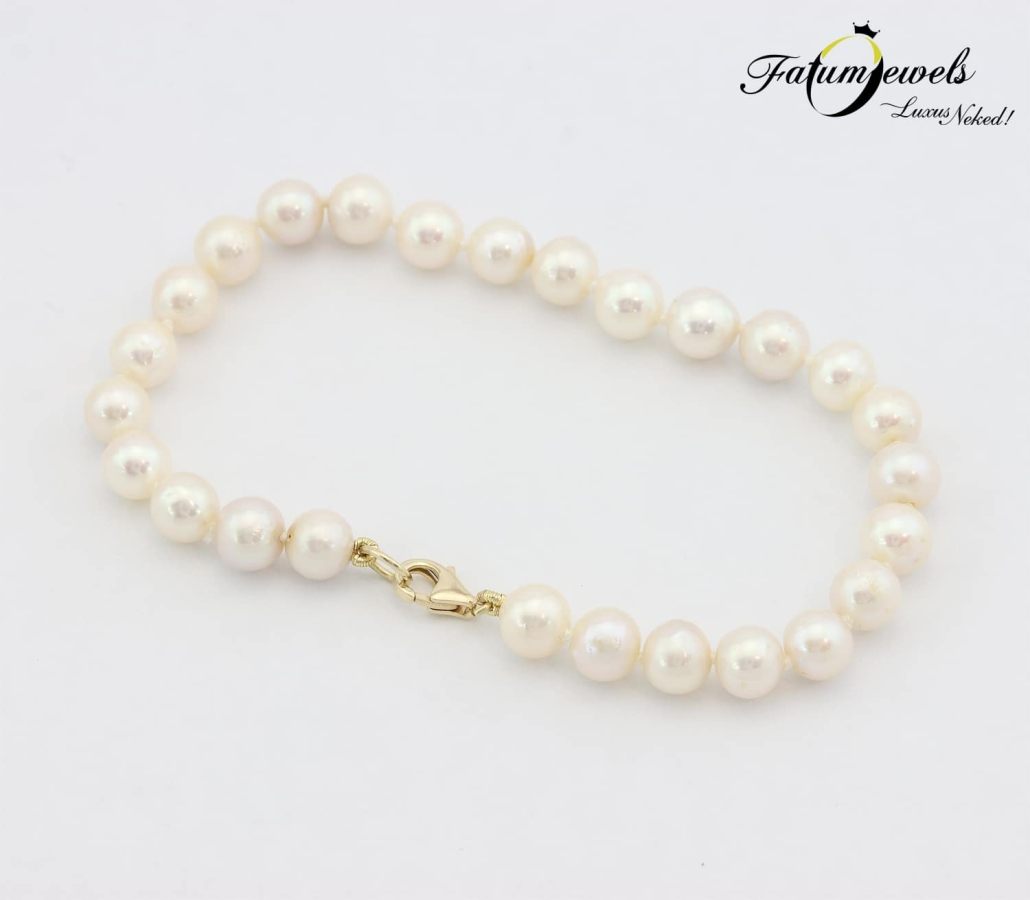 Megfelelő menyasszonyi ékszert keresel? Egy gyöngysor vagy egy gyöngy karkötő tökéletes választás lesz. Ez a hófehér Fatumjewels sósvízi Akoya gyöngy karkötő éppen megfelelő kiegészítő lesz a menyasszonyi megjelenéshez. A gyöngy karkötő 26 szem kerek gyöngyből áll, melyek egyenként kézzel lettek csomózva. A kapocs sárga arany, a gyöngy karkötő hossza 19,5 cm. Fatumjewels Akoya gyöngy karkötő.