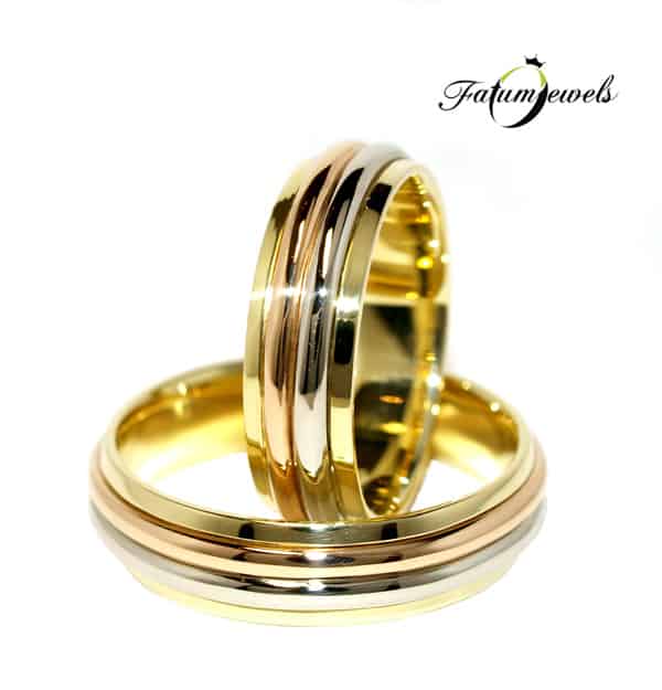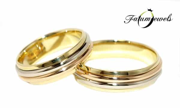 Ha nem tudtok dönteni a színek között, ám mégsem szeretnétek túldíszített karikagyűrű párt, akkor ez éppen nektek való. Trikolor karikagyűrű, mely az arany összes árnyalatát megmutatja. A formai kialakítás változatos, a domború és a sík elemek váltakoznak egymással a karikagyűrű felszínén. A fényes felszín még jobban kiemeli a hideg és meleg színek összhangját.