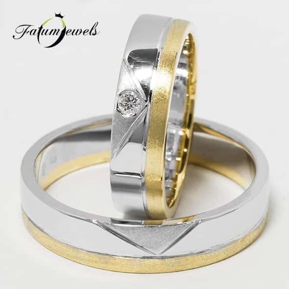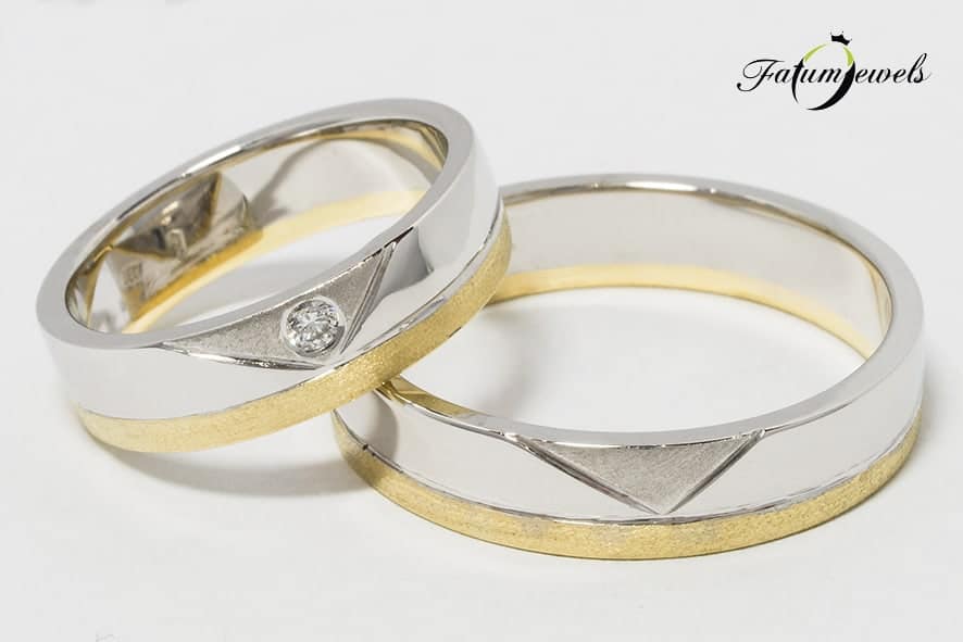 Mértani formák és érdekes felületkezelés jellemzi ezt a bikolor karikagyűrű párt, ám a fehérarany fényes felülete, valamint a briliáns gyémánt mégis a romantikára utal. Az egyszerű vonalvezetést ellensúlyozza a sárga arany érdekes csillogása, mely a nem hétköznapi felületkezelésből fakad.