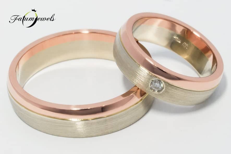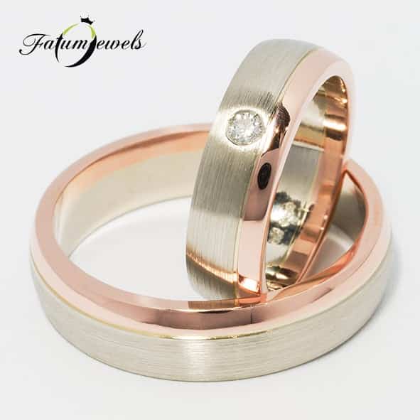 Szeretitek a romantikus filmeket? Akkor ez a fehér-rózsaszín karikagyűrű a kedvencetek lesz. A fehérarany finom szálhúzott felülete és a vörös arany fényes rózsaszínes árnyalata adja meg a romantikus összképet. A túlzott érzelgősségtől sem kell tartani, hiszen a karikagyűrű egyenes szélei visznek némi józanságot az összképbe. A karikagyűrű női párjába egy 2,25 mm-es briliáns gyémánt került, ami gyönyörű fényével megadja a kellő csillogást.