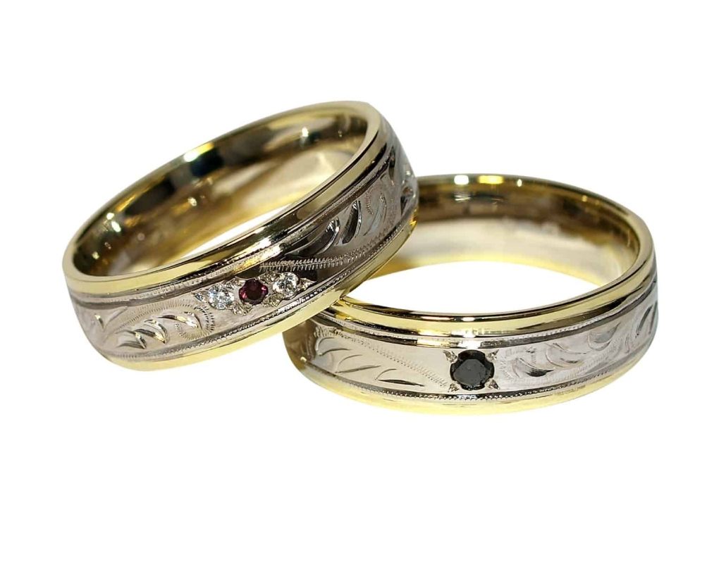 Bár a barokk korszak letűnt, a stílus időtlen. Ez a finoman cizellált karikagyűrű azoknak ajánlott, akik nem elégednek meg az egyszerű díszítéssel. A bonyolult mintázatot a karikagyűrű női párjában lévő két fehér, valamint egy burgundi gyémánt koronázza meg. A karikagyűrű férfi párja sem maradt drágakő nélkül, ám stílusosan ez fekete gyémántdíszítést kapott.