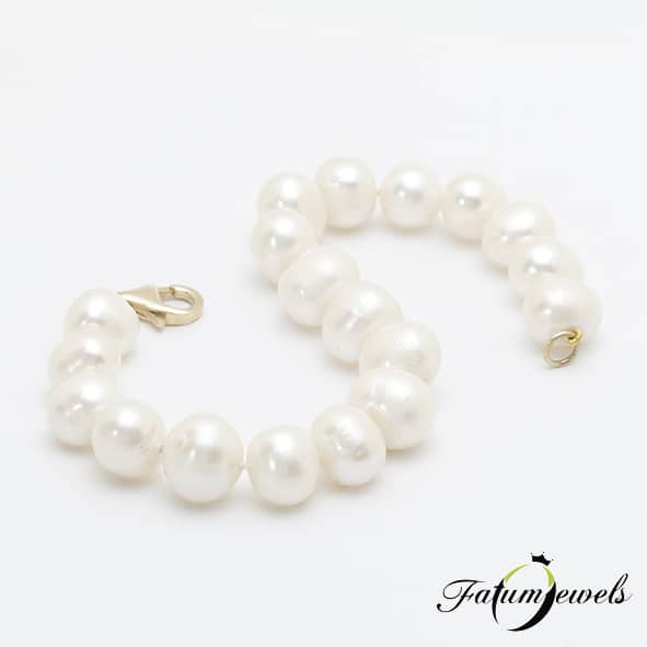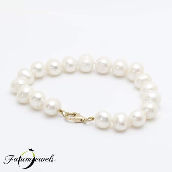 Fatumjewels fehér gyöngy karkötő sárga arany kapoccsal, meglepően kedvező áron a Fatumjewels Galéria gyöngy ékszer kínálatában. A fehér gyöngyök oválisak, enyhén barokkos formájúak, ami érdekes és meglepően kellemes látvány. A gyöngy karkötő ára meghökkentően kedvező, mely révén nemcsak esküvői ékszerként, hanem akár meglepetés ajándékként is rendkívüli lehet.