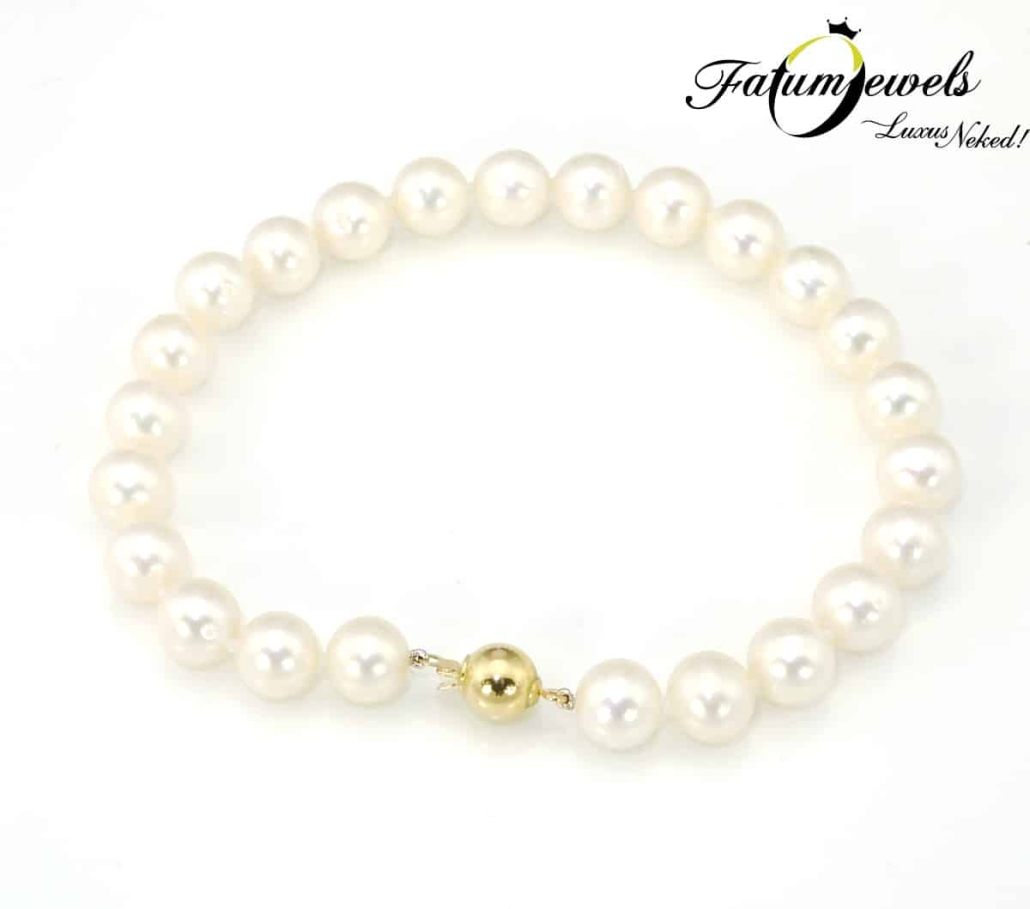 Selymes fényű valódi gyöngy és sárga arany kapocs. Kell ennél tradicionálisabb színösszeállítás? Hagyományos ruházathoz jól illeszkedő ékszert keresel? Ilyen esetben a fehér gyöngy mindig jó választás. Ajándéknak is jó lehetőség, hiszen nagyszerű áron elérhető ez az édesvízi fehér gyöngy karkötő a Fatumjewels Galéria választékában.