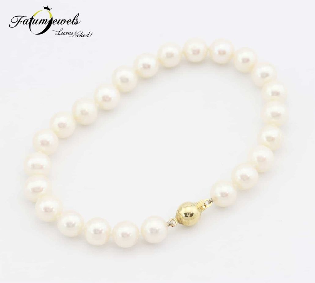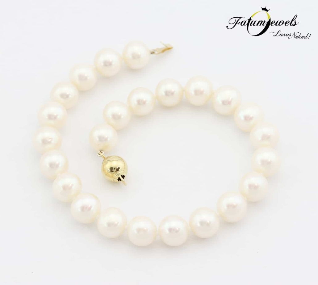 Gömb alakú fehér enyhén barokkos gyöngyökből álló karkötő, mely elérhető áron luxust biztosít számodra. Hagyományokat kedvelő hölgyek kedvence lehet ez a Fatumjewels gyöngy karkötő, mely 24 szem gyöngyből áll, hossza 20,5 cm. Bármilyen viselethez tökéletes kiegészítő lehet, magas lüsztere emeli a megjelenésed fényét. Akár menyasszonyi ékszerként is megállja a helyét.
