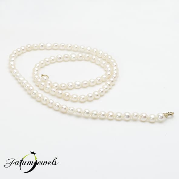 Boldog békeidők eleganciája a fehér gyöngysor, mely napjainkban is trendi. Ez a fehér gyöngysor meglepően kedvező áron elérhető a Fatumjewels Galéria kínálatában, hiszen jogod van az eleganciához. Akár menyasszonyok megjelenéséhez is kitűnő kiegészítő lehet ez a 92 szemből álló édesvízi fehér gyöngysor arany kapoccsal.