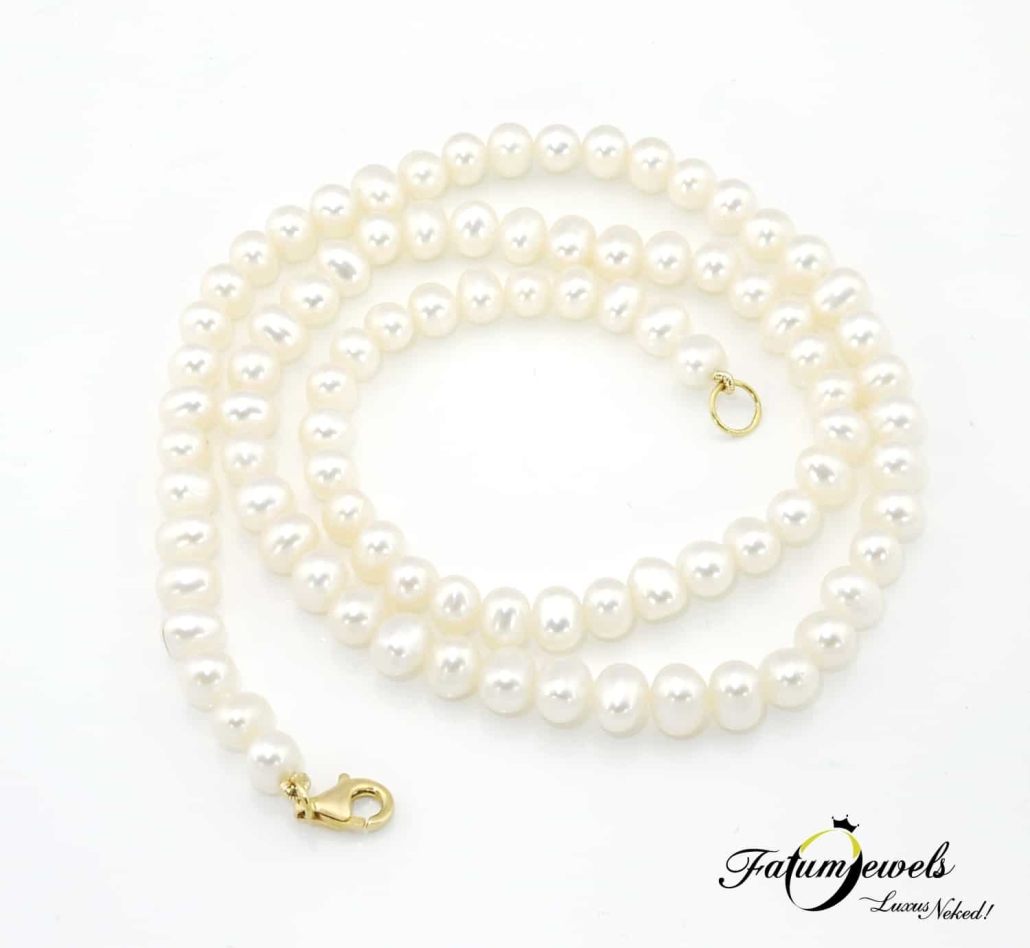 A tradicionális megjelenés szinte elengedhetetlen velejárója a fehér gyöngysor, különösen akkor, ha alkalmi ruhához keresünk hagyományos kiegészítőt. Egy fehér gyöngysorral soha nem választhatunk rosszul, hiszen minden színösszeállításhoz nagyszerűen illik. A Fatumjewels Galéria most roppan kedvező áron kínálja ezt a sárga arany kapoccsal ellátott édesvízi fehér gyöngysort.