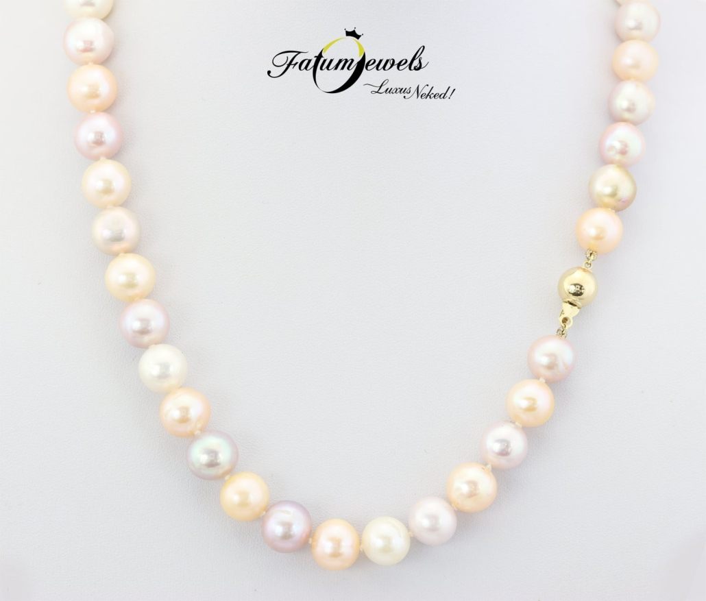 Valódi édesvízi gyöngysor válogatott pasztell színű gyöngyökből kézzel fűzve, szemenként csomózva a Fatumjewels Galériában. Esküvői vagy alkalmi ékszerként tökéletes választás a vidám, színes ékszereket kedvelő hölgyek számára. A mindennapokban is tökéletes választás ez a színes gyöngysor, mely minden színű és típusú öltözékhez jól illeszkedik.
