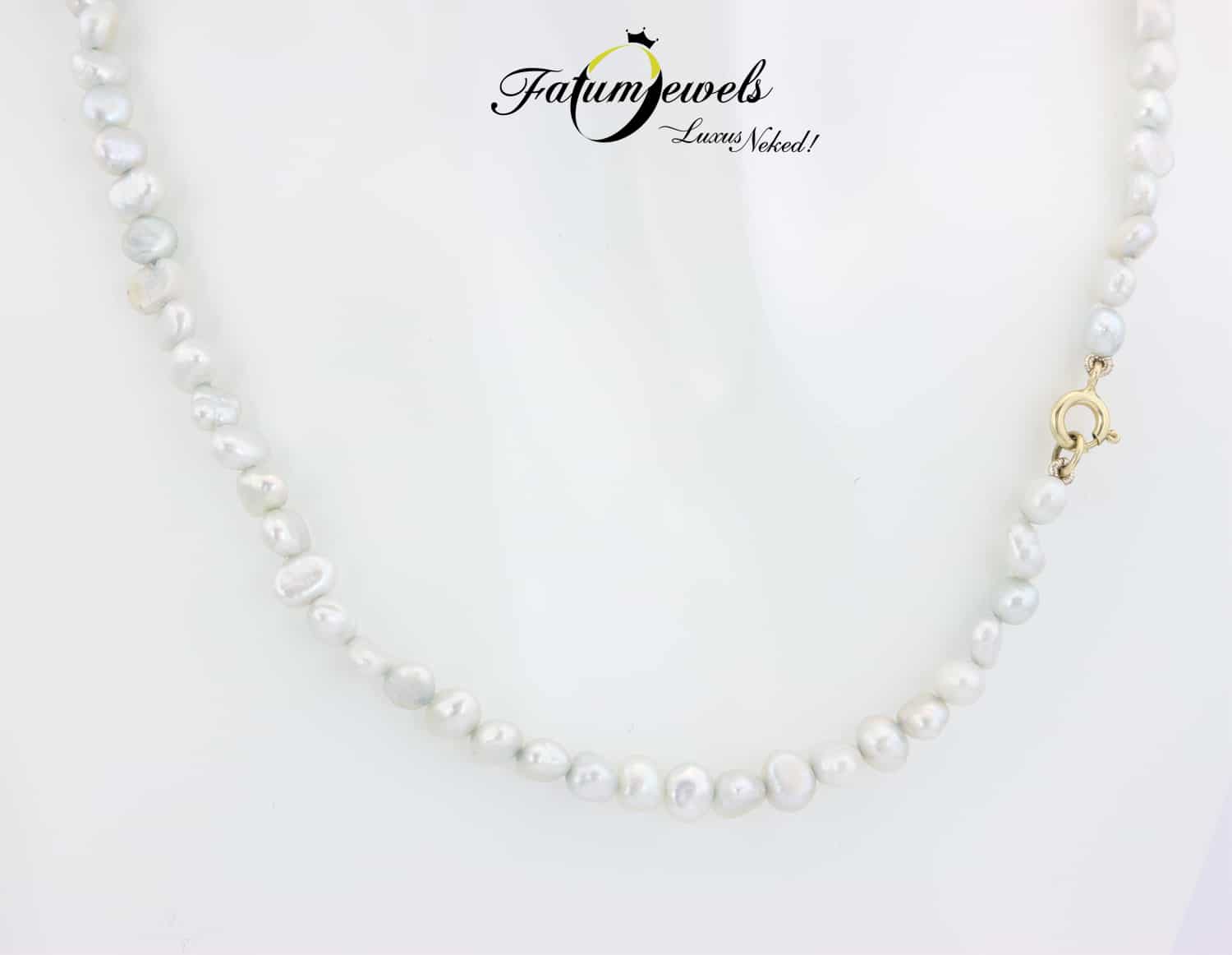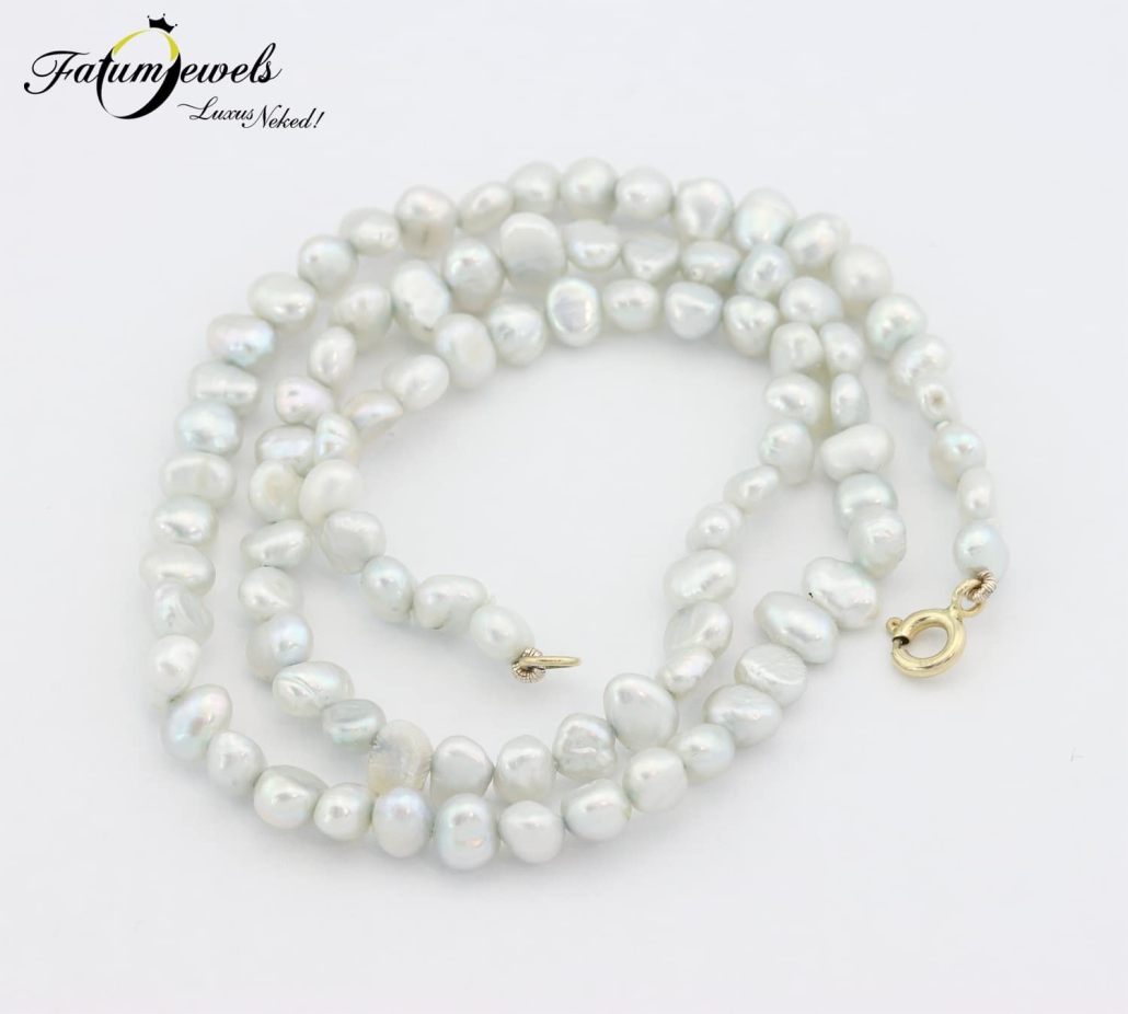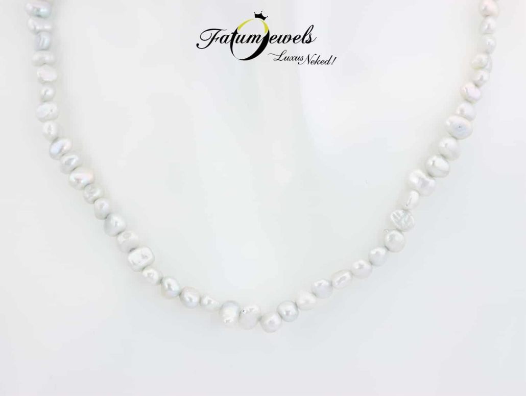 Fatumjewels ezüstszínű édesvízi tenyésztett gyöngysor valódi gyöngyökből, meglepően kedvező áron a Fatumjewels Galéria gyöngy ékszer kínálatában. A gyöngysor 90 szem gyöngyből áll, melyek kézzel csomózottak. Az amorf formájú gyöngyszemek teszik tökéletesen egyedivé a természet eme remekművét. Nincs két egyforma gyöngyszem, mindegyik egyedi formájú, és ez teszi mégis tökéletessé. A kapocs sárga arany, ami némi kontrasztot jelent az ezüstszínű gyöngyökkel, ám éppen ez az egyik érdekessége ennek a gyöngy ékszernek. Bármilyen alkalomra kedves ajándék lehet.