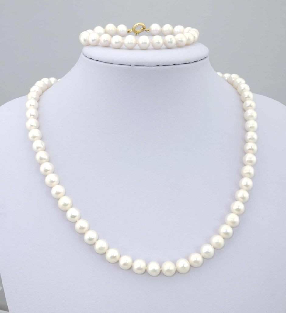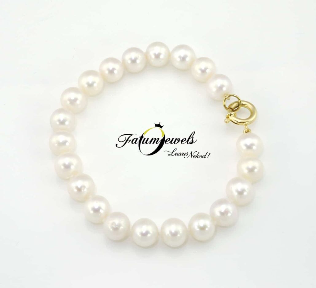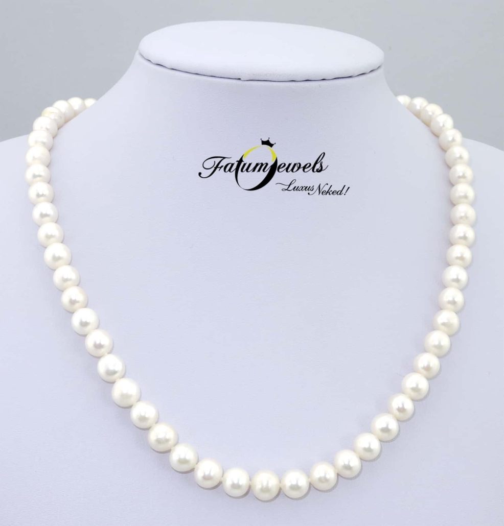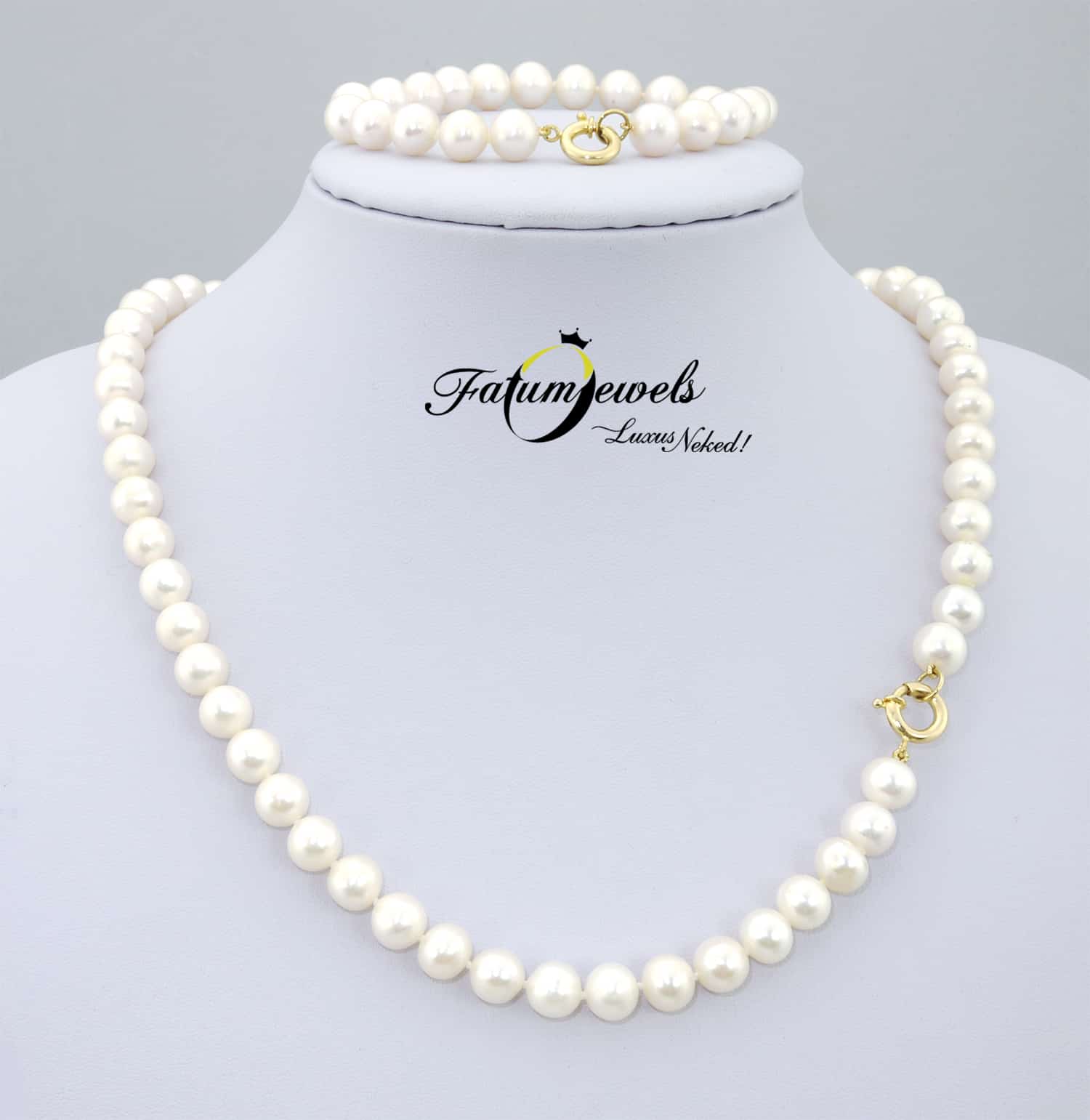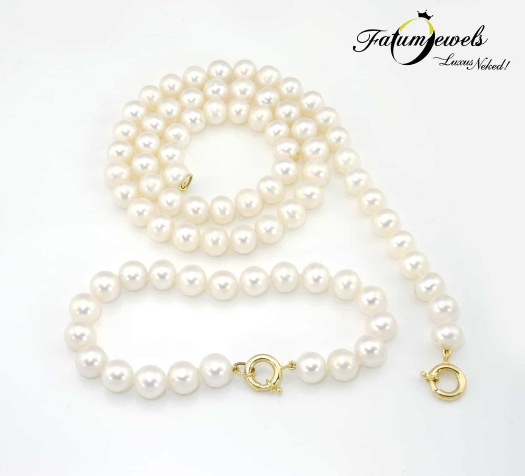 A víz mélyéről származó csodásan csillogó fehér gömbök, melyek egy fehér gyöngysor és karkötő formájában teljesednek ki rajtad. Kagylók teremtették ezeket a hófehér gyöngyöket, hogy megjelenésed semmiben ne szenvedjen hiányt. Sárga arany kapocs fogja össze a gyöngysor és a karkötő végeit, melyek tökéletes látványt nyújtanak, ha hagyományos megjelenésre vágysz. Fatumjewels édesvízi fehér gyöngy szett.