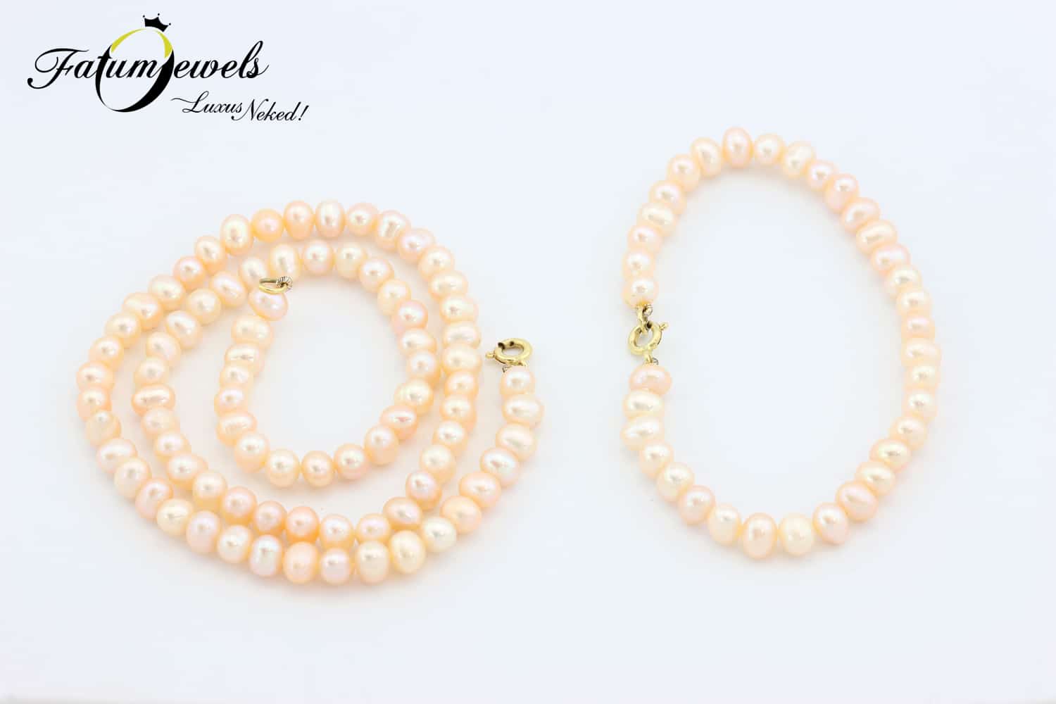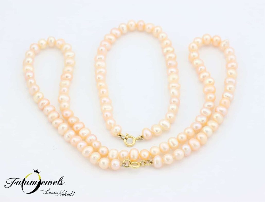 Barackszín ragyogás egy édesvízi gyöngysor és egy édesvízi gyöngy karkötő formájában a Fatumjewels Galéria gyöngy szett palettáján. A gyöngysor és a gyöngy karkötő összesen 117 szem gyöngy drágakőből áll, sárga arany kapocs fogja össze a végeiket. Szeretnél egy gyöngysort és egy gyöngy karkötőt, de a fehér helyett inkább romantikus színre vágysz? Ez a barack gyöngy szett kedvedre lesz.
