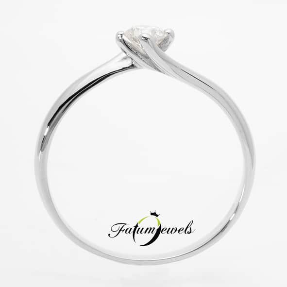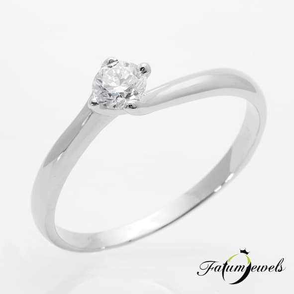 Ez az eljegyzési gyűrű mintha arra lett volna teremtve, hogy körülölelje, tartsa a gyémántot. A gyűrűvégek ívben hajlítottak, csavartak, így két ellentétes oldalról tartják a briliáns gyémántot. Az eljegyzési gyűrű egyenes szélei még jobban kiemelik az ívelt formákat. Fatumjewels eljegyzési gyűrű tervezés a lényeg kiemelésére.