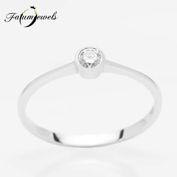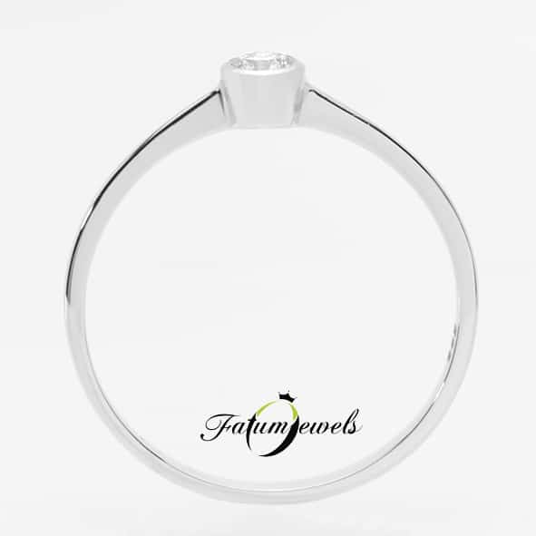 Egyszerű vonalvezetésű gyémánt eljegyzési gyűrű, melynek különlegessége a tömör, kerek fehérarany gyémántfoglalat. A gyűrűvégek függőlegesen kiemelkednek a gyémánt közelében, ezzel még feltűnőbbé válik a kerek foglalat és a mélytüzű briliáns gyémánt. Mindez nagyon kedvező áron elérhető a Fatumjewels Galéria eljegyzési gyűrű kínálatában.
