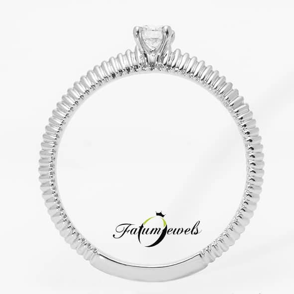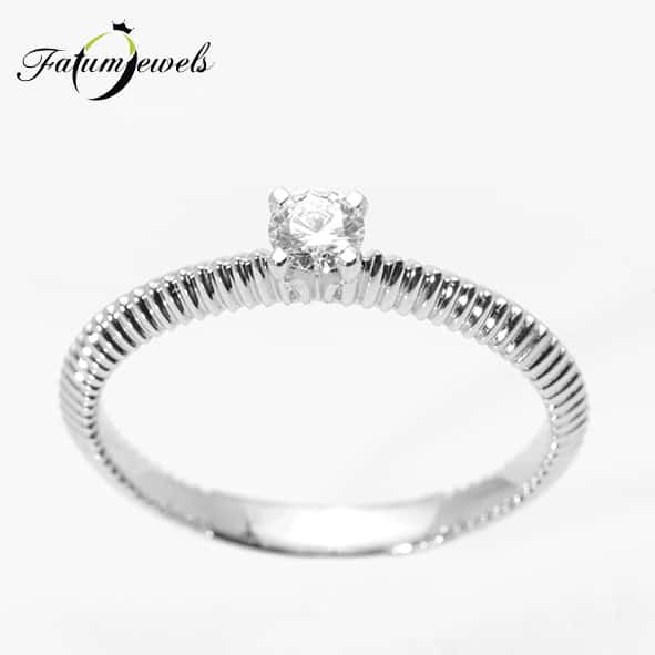 A bordázott fehérarany felülettől szikrázik a levegő, mely versenyre kel a briliáns gyémánt ragyogásával. Különleges formatervezésű gyémánt eljegyzési gyűrű a Fatumjewels Galéria tervezőasztaláról olyan hölgy számára, aki egyszerre hagyománytisztelő és emellett kedveli a modern formákat. Csodás formák valódi gyémánt drágakővel. Fatumjewels gyémántgyűrű.