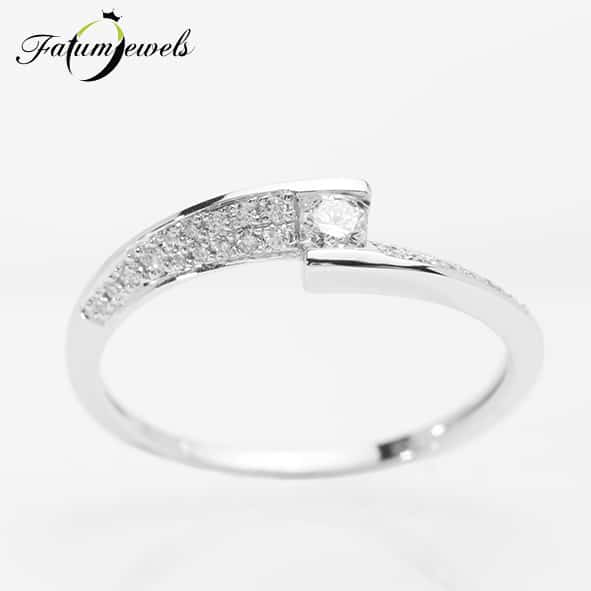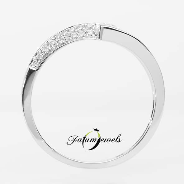 Modern, ragyogó, mégis visszafogott formatervezésű gyémántgyűrű a Fatumjewels Galéria tervezésében. Befelé forduló gyűrűvégek briliáns gyémánt drágakövekkel díszítve, melyek egy központi gyémántot fognak közre. Fiatal, illetve fiatalos gondolkodású hölgyek számára egyaránt ajánlott. Akár eljegyzési ajándéknak is megfelelő választás lehet.