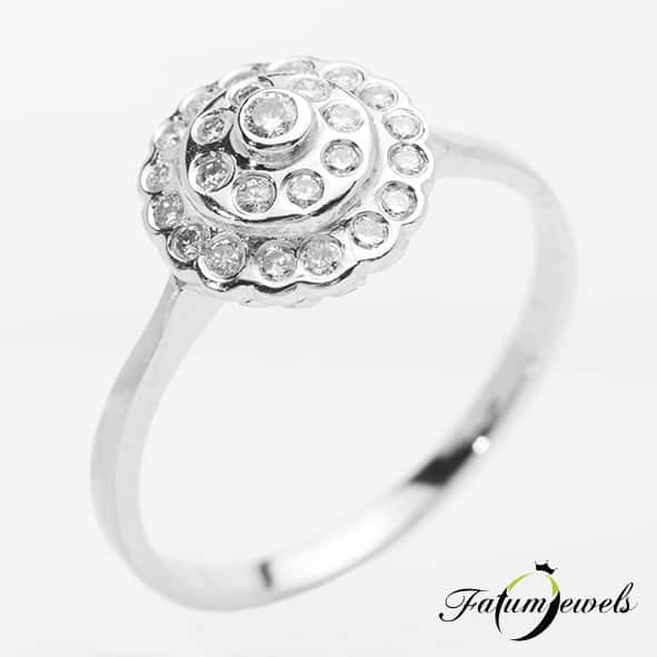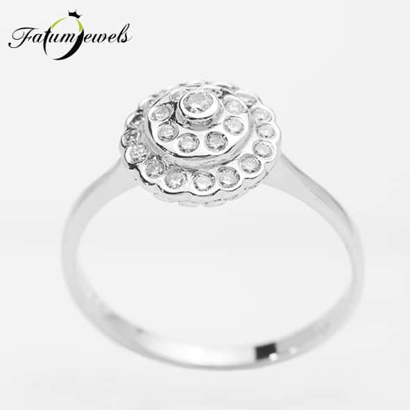 Pontosságot kedvelő és ezt elváró hölgyek kedvence lehet ez a Fatumjewels Gyémántrózsa gyémántgyűrű. A fehérarany drágakő foglalat többszintes, rózsát formázó alakja süllyesztett briliáns gyémántokat foglal magában, melyek mérnöki pontossággal lettek elhelyezve. A Fatumjewels Galéria eljegyzési gyűrűként is ajánlja ezt az ékszert.