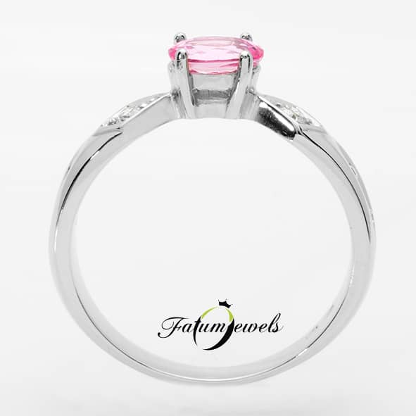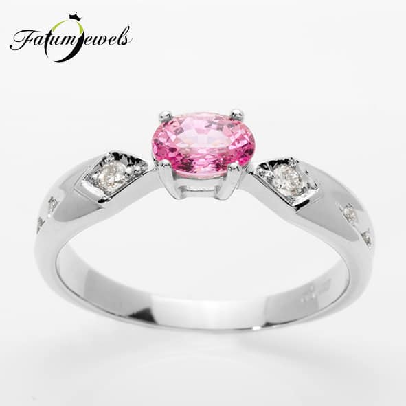 Érdekes formai kialakítású rózsaszín zafír gyűrű briliáns gyémántokkal a Fatumjewels Galériában. A gyűrűszélek nyíl alakban futnak bele a vízszintesen elhelyezett ovális rózsaszín zafírba. Ez a nyíl alak valójában a briliáns gyémántok rombusz alakú foglalatának vonalát követi. Ez a rózsaszín zafír gyűrű különleges ajándék bármilyen alkalomra.