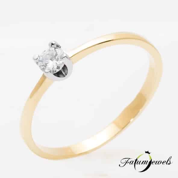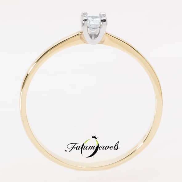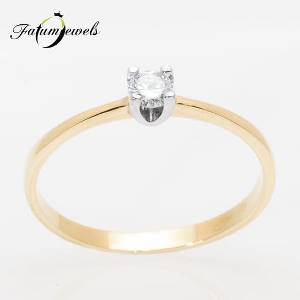 Egyenes vonalú sárga arany eljegyzési gyűrű egyenes szélekkel, briliáns gyémánttal. Az egyszerű ékszerek kedvelőinek ajánlott ez az eljegyzési gyűrű, melyen a gyémánt foglalattal együtt kiemelkedik a gyűrű síkjából, ahogy az a tradicionális eljegyzési gyűrű típusoknál megszokott. Fatumjewels eljegyzési gyűrű a hagyomány jegyében.