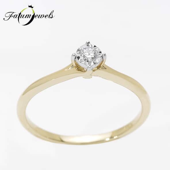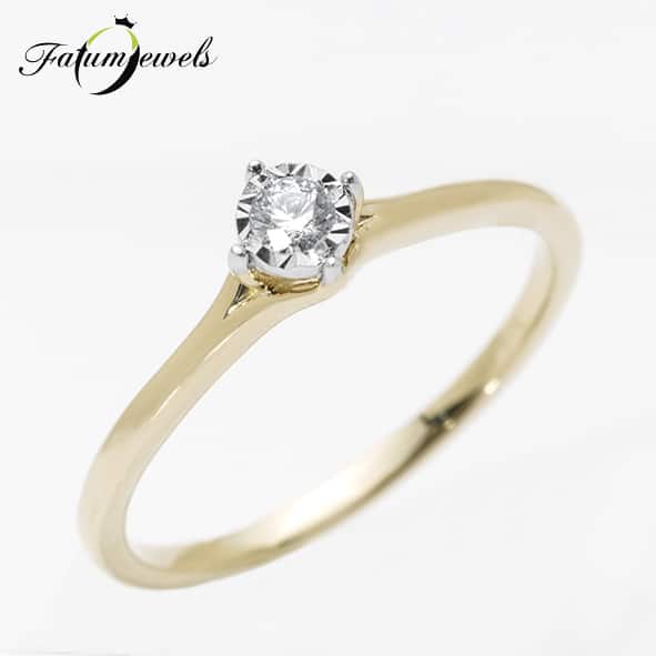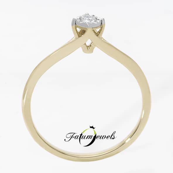 Fatumjewels gyémánt eljegyzési gyűrű érdekes drágakő foglalattal. A gyűrű vonalvezetése egyszerű, mely a briliáns gyémánt közvetlen közelében válik érdekessé. A gyémánt alatt a gyűrűvégek szétválnak, hegyesen kicsúcsosodnak, a foglalat másik része átível alattuk. Az ékszer felülről tekintve hagyományos eljegyzési gyűrű látványát nyújtja. Mindez alacsony áron elérhető a Fatumjewels Galériában.