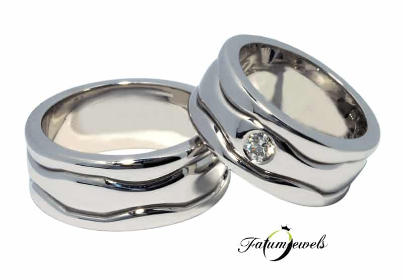 Ívelt és sarkos formák váltakozása díszíti ezt a 9 mm széles fehérarany karikagyűrű párt, melynek női párját 0,15 karát briliáns gyémánt díszíti. A karikagyűrű fényes felülete még hangsúlyosabbá teszi az extra szélességet és a különleges vésett formákat.