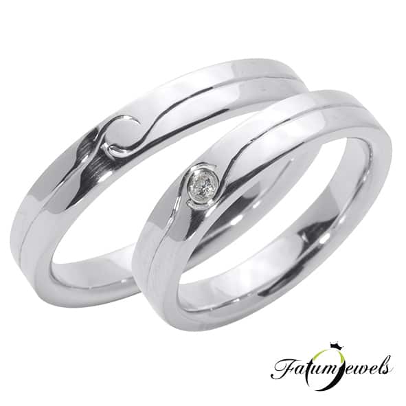 Finom Vonalak fehérarany karikagyűrű ívelt vésett mintával, fényes felülettel a romantikus életérzésért. A vésett vonalak enyhén kacskaringós szélei fogják közre a briliáns gyémántot a karikagyűrű női párjában, mely szépen kiemeli a 4 mm széles karikagyűrű leheletfinom formáit.