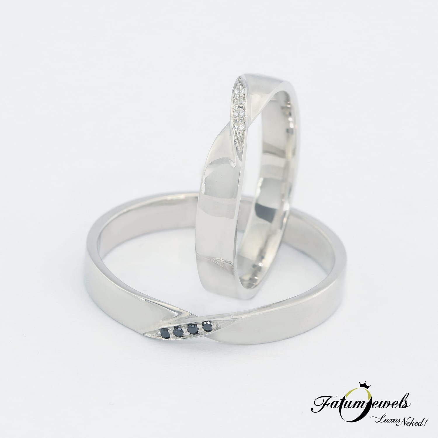 Ez a fehérarany csavart karikagyűrű pár azoknak készült, akik nem szeretnének választani hagyomány és egyediség között, mert hisznek abban, hogy a kettő tökéletes harmóniában is együtt létezhet. A lágyan ívelt, csavart forma olyan, mint maga a kapcsolat: összefonódott, folyamatos mozgásban lévő egység, amely mégis időtálló és erős. A fehér gyémántok a tisztaságot, a reményt és a hűséget szimbolizálják, míg a fekete gyémántok a mélységet, az erőt és a titkokkal teli belső világot. Együtt olyan kontrasztot teremtenek, ami nem megoszt, hanem kiegészít – épp úgy, ahogyan két különböző ember alkot egy tökéletes egészet.