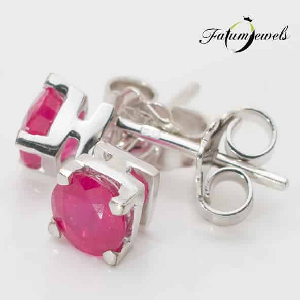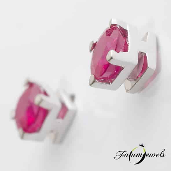 Fehérarany rubin fülbevaló két kerek csiszolású vörös rubin drágakővel. A Fatumjewels Galéria elsősorban fekete hajú vagy szőke hölgyeknek ajánlja, hiszen így tud kiteljesedni a vörös rubinnal a tökéletes kontraszt.