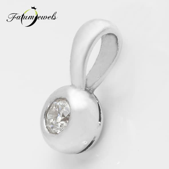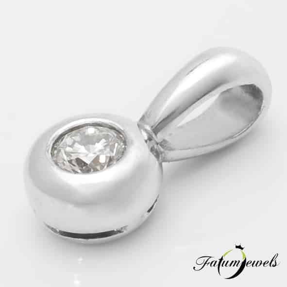 Egyetlen él sem található ezen a lekerekített formájú fehérarany medálon, melynek zárt, tömör foglalatában egy briliáns gyémánt kapott helyet. A fehérarany fényes felszíne és a gyémánt briliáns formája gyönyörű ragyogást biztosít, mindez roppant kedvező áron található meg a Fatumjewels Galéria kínálatában. Fatumjewels tervezés.
