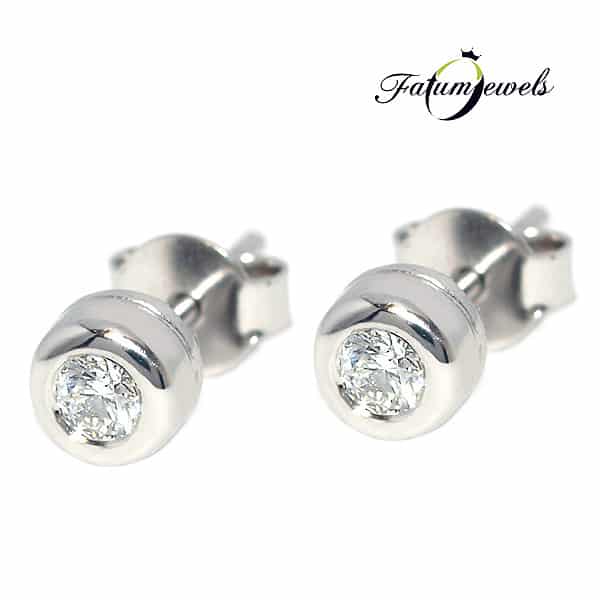 A letisztult formák kedvelőinek készült ez a gyémánt fülbevalópár a Fatumjewels Galéria tervezésében. A tömör fehérarany foglalatba süllyesztve került elhelyezésre a 0,14 karát briliáns gyémánt. Diszkrét, bájos, elegáns viselet, akár a hétköznapokban is. Fatumjewels gyémánt fülbevaló.