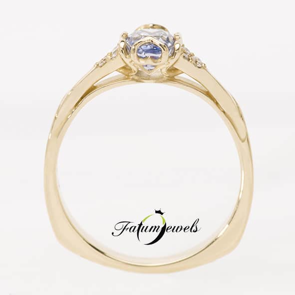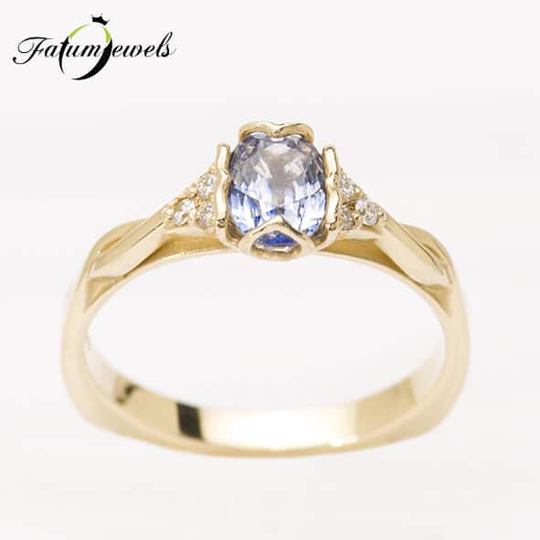 Fatumjewels Arabic sárga arany gyémánt zafír gyűrű, ahol a napfényes égbolt és a ragyogó napsütés találkozik egymással, mindez briliáns gyémántokkal ékesítve. Az áttetsző világoskék zafír 1,00 karát, mely érdekesen hullámzó sárga arannyal van övezve. A gyűrű alul sarkos kialakítású.