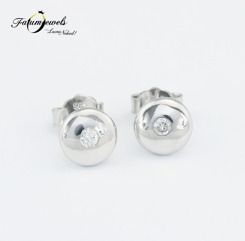 Különleges formatervezés, selymesen fénylő fehérarany és két briliáns gyémánt. Ezekből hozta létre a Fatumjewels Galéria ezt a fehérarany gyémánt button fülbevalót, mely kitűnő áron elérhető a gyémánt ékszer kínálatban. Kerek, domború formák a fény játékának engedve egyszerű eleganciát nyújtanak számodra.