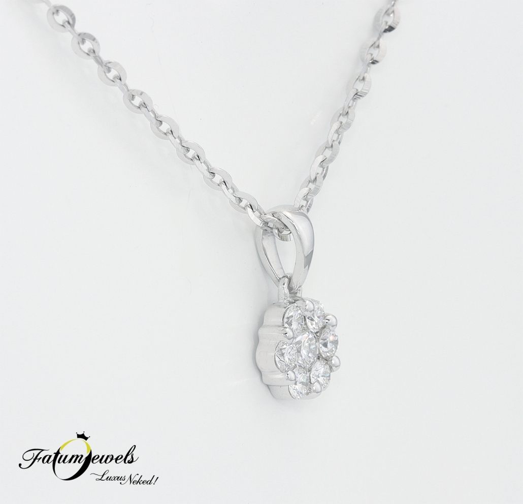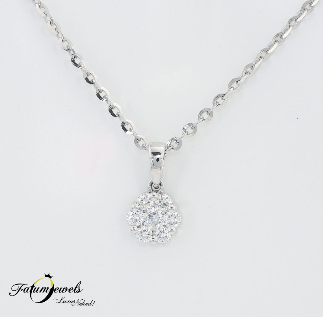 A bűvös hetes számé a főszerep újra. Hét briliáns gyémánt alkotta gyémántvirág a dísze ennek a fehérarany egyedi gyémánt medálnak. Szemből szemlélve ugyan képtelenség megszámolni a gyémántokat, hiszen ragyogásuk teljesen elvakít. A csodás fénytörést sokszorosára növeli a hét briliáns gyémánt. A Fatumjewels Galéria különleges hölgy számára tervezte.