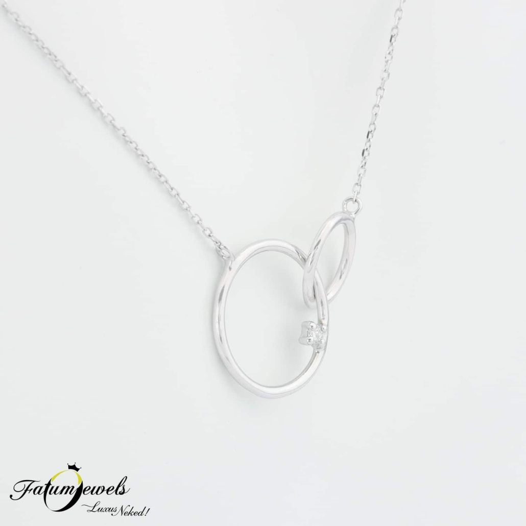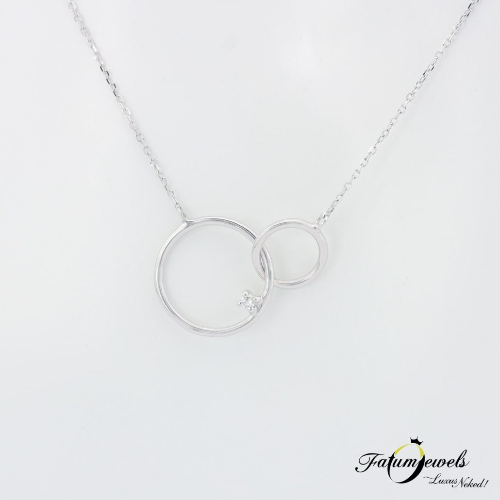 Fedezze fel ezt az időtlen szépségű fehérarany gyémánt medált, amely két, finoman egymásba kapcsolódó karikával testesíti meg az összetartozás és az örök kötelék szimbólumát. Az egyik karikát egy apró, de annál ragyogóbb 0,015 karátos briliáns díszíti, melynek csillogása különleges eleganciát kölcsönöz viselőjének.