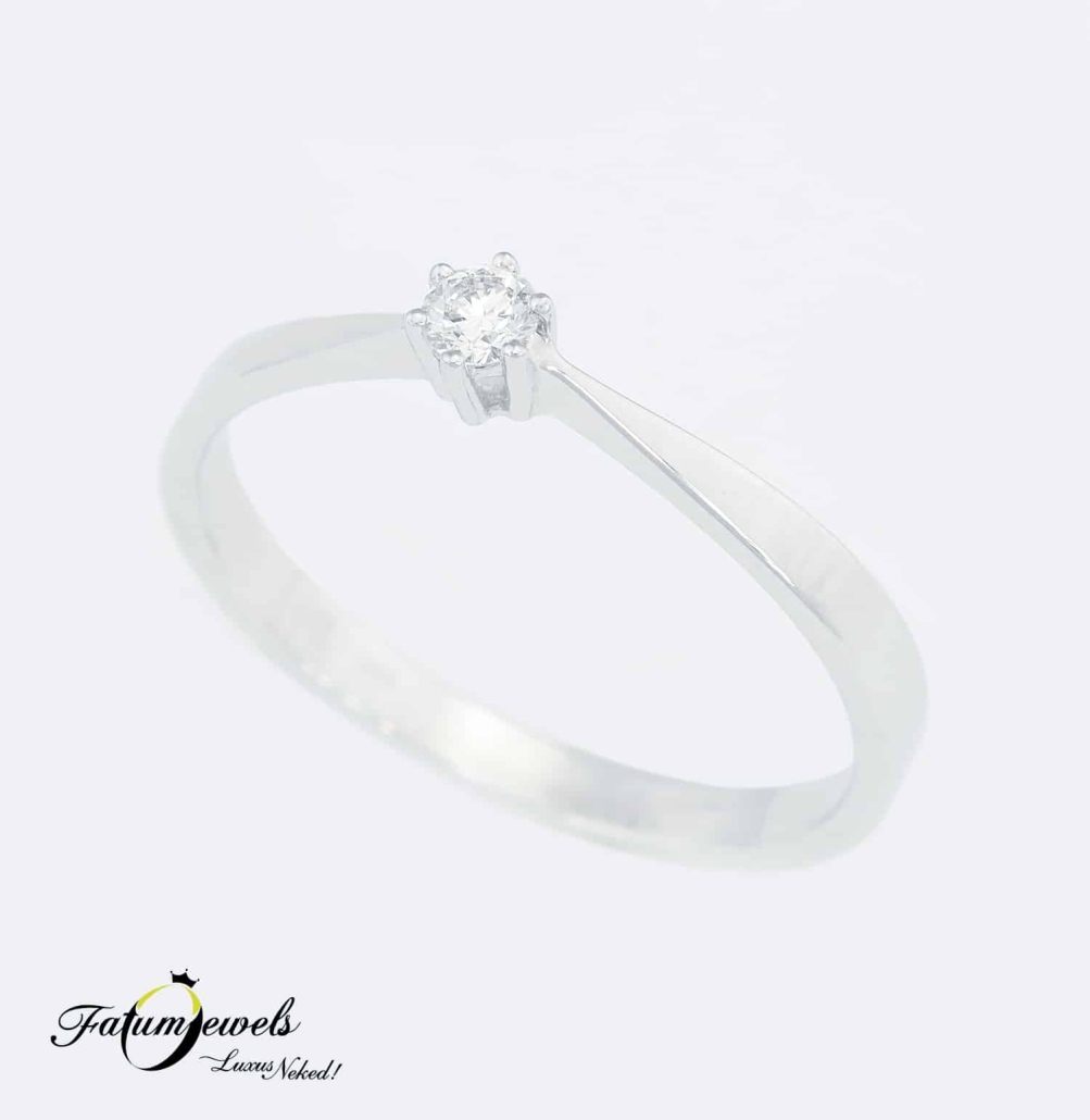 Fehérarany eljegyzési gyűrű egy briliáns gyémánt drágakővel. Nem érdemes tovább várnod a lánykéréssel, tedd meg most ezt a fontos lépést. A Fatumjewels Galéria kitűnő áron elérhető eljegyzési gyémántgyűrű kínálatával segít számodra, hogy az utolsó akadály is elháruljon, és feltehesd kedvesednek a nagy kérdést.