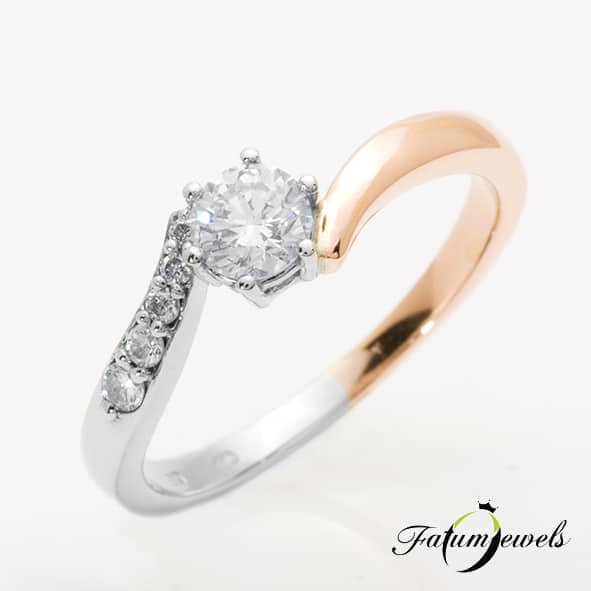 Feminine gyémánt eljegyzési gyűrű a Fatumjewels Galéria tervezésében rozé és fehéraranyból, 0,37 karát briliáns gyémánttal. Az eljegyzési gyűrű színelosztása szimmetrikus, pontosan a gyűrű felénél ér véget a rozé arany és kezdődik a fehérarany. A szimmetria azonban itt véget is ér, hiszen a gyűrűvégeknél a fehérarany rész plusz gyémántdíszítést kapott.