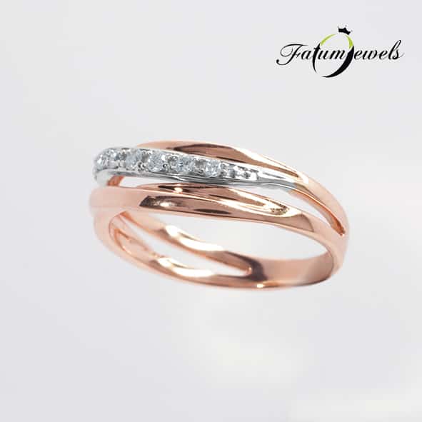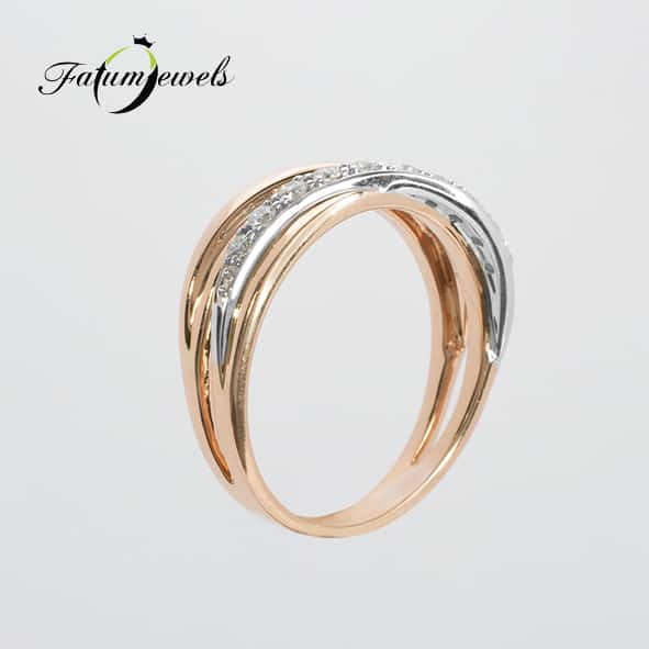 Fatumjewels Fonat eljegyzési gyűrű briliáns gyémántokkal. Az eljegyzési gyűrű három részre válik szét, hogy aztán azok összefonódjanak egymással. A briliáns gyémántok a fehérarany részen kaptak helyet, mellyel párhuzamosan fut a rozé arany rész, ahol a színek szépen harmonizálnak. Különleges eljegyzési gyűrű kedvező áron a Fatumjewels Galériában.