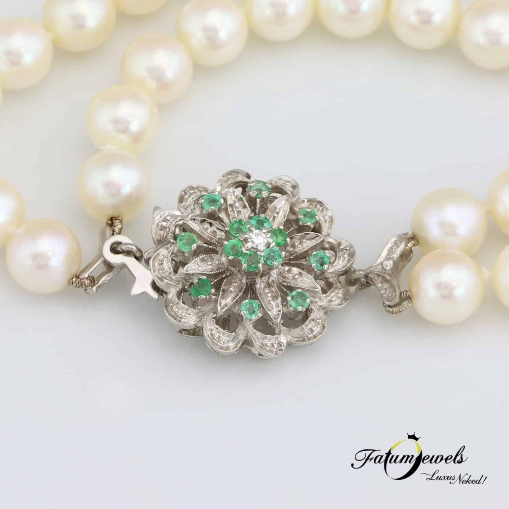 Régi korok hangulatát idéző kétsoros gyöngy nyakék smaragdvirággal díszítve. A smaragd drágakövekkel ékesített fehérarany virág enyhén vintage stílusú, a dupla gyöngysor pedig törtfehér. Mintha a 20. század első felébe csöppentél volna ezzel a Fatumjewels egyedi gyöngy nyakékkel. Alkalmi viselethez elegáns, hétköznapi viselethez stílusos ékszer.