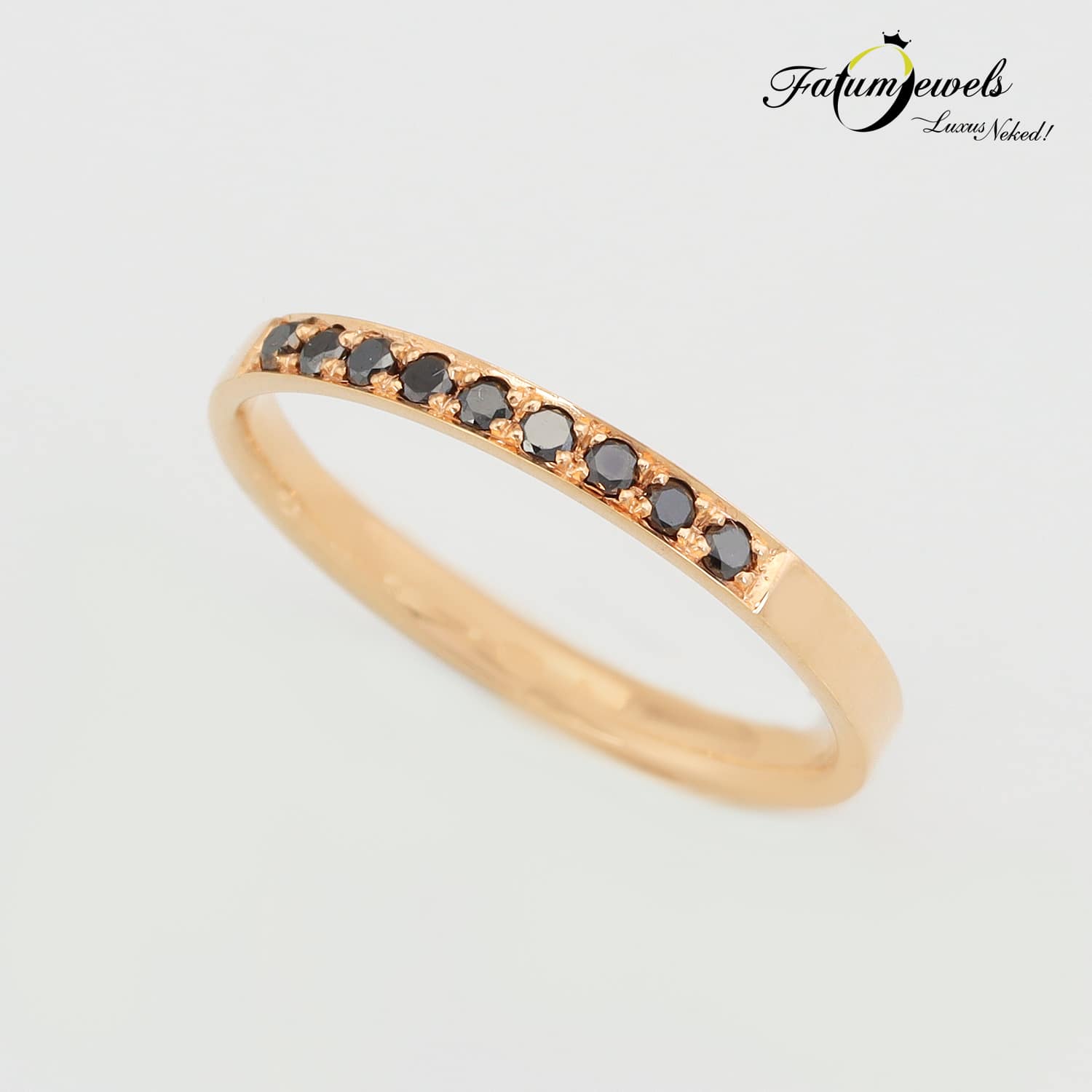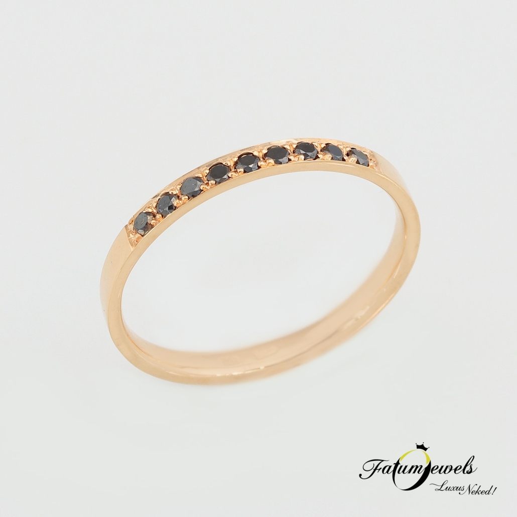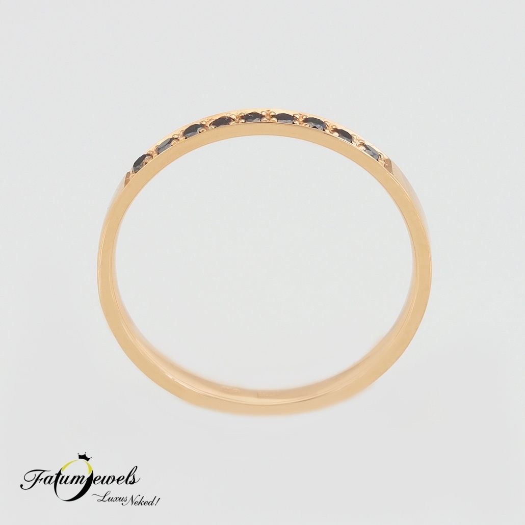 Karikagyűrű vagy eljegyzési gyűrű? A választás a Tiéd. Romantika és rejtély egy ékszerbe sűrítve. A romantikus rozé arany szinte átöleli a fekete gyémántsort, erős szövetséget alkotnak, így jött létre ez a fekete gyémánt alliance gyűrű. Eljegyzési vagy esküvői ajándéknak szánod? Bárhogy döntesz, az lesz a jó választás. A Fatumjewels Galéria fekete gyémánt ékszerei között kitűnő áron megtalálod ezt az ékszert.