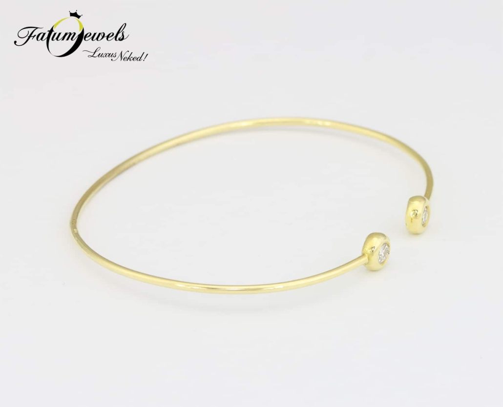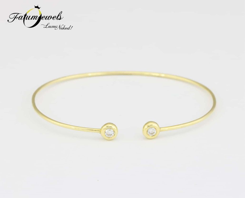 Ez a gyémánt karperec valóban olyan, mint egy eljegyzési gyűrű a csuklódon. Hasonló formatervezésű eljegyzési gyűrűvel tökéletes ékszer párost alkothatnak. A sárga arany és a briliáns gyémánt klasszikus ékszert eredményeznek, a karkötő formája azonban teljesen újszerű. Egyéb sárga arany ékszerekkel elegáns esküvői kiegészítő lehet ez a gyémánt karperec a Fatumjewels Galéria egyedi ékszerei közül.