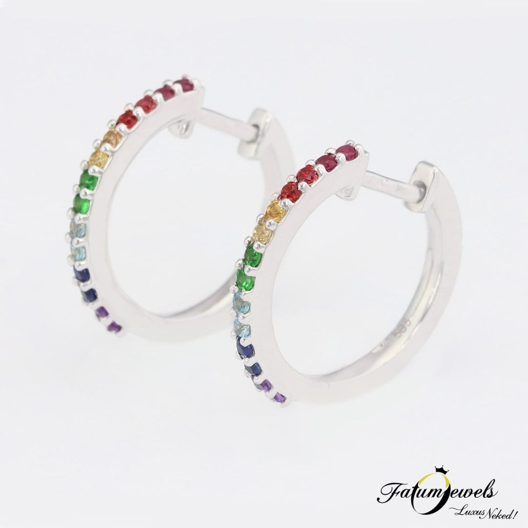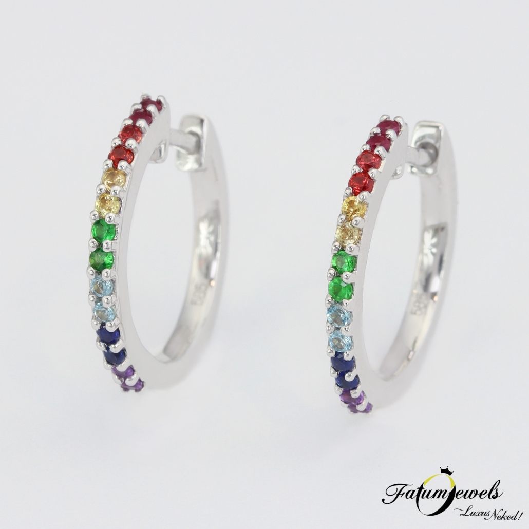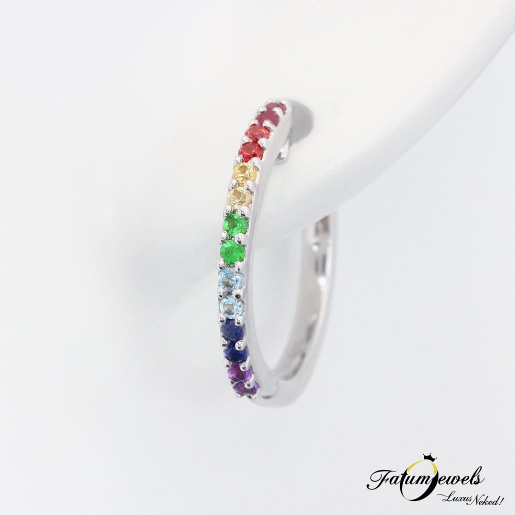 A legenda szerint a szivárvány tövében van a kincs. Mérhetetlen gazdagság van oda elásva, ám azt a helyet nagyon nehéz elérni, eddig csak keveseknek sikerült. Most azonban az egész szivárvány a tiéd lehet ezzel a Fatumjewels Galéria által megalkotott színes drágakő karika fülbevalóval. Egyedi színes fülbevaló valódi drágakövekkel díszítve.