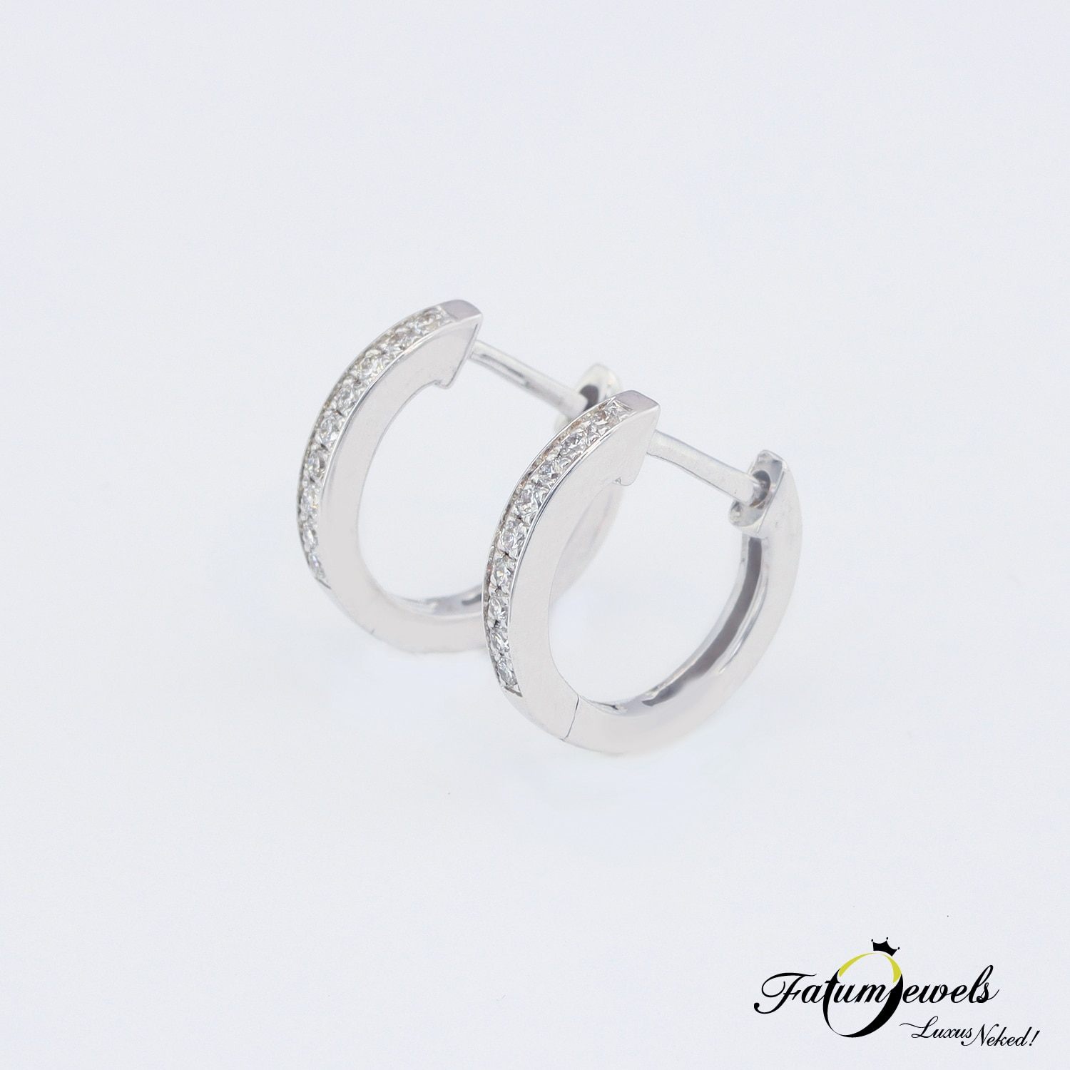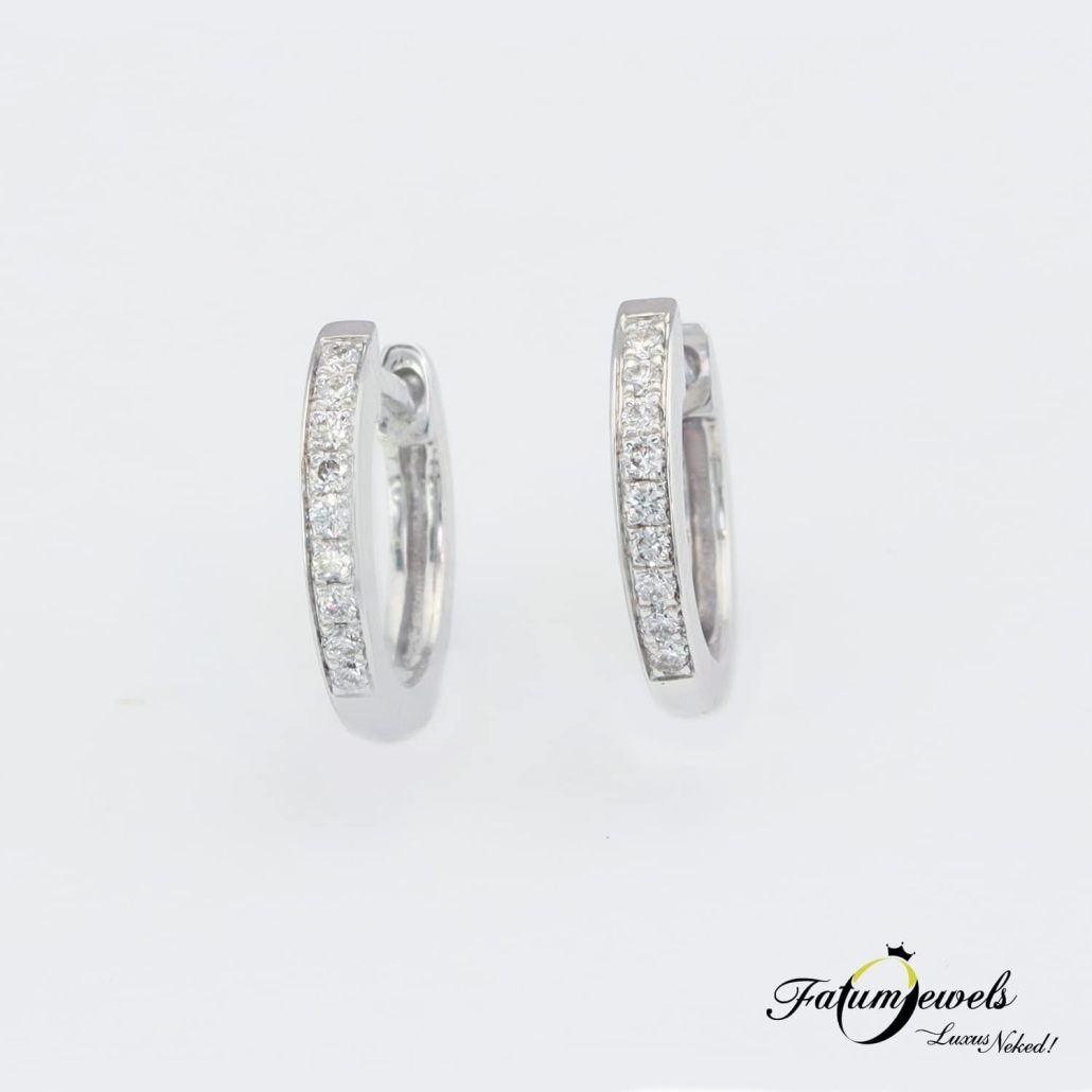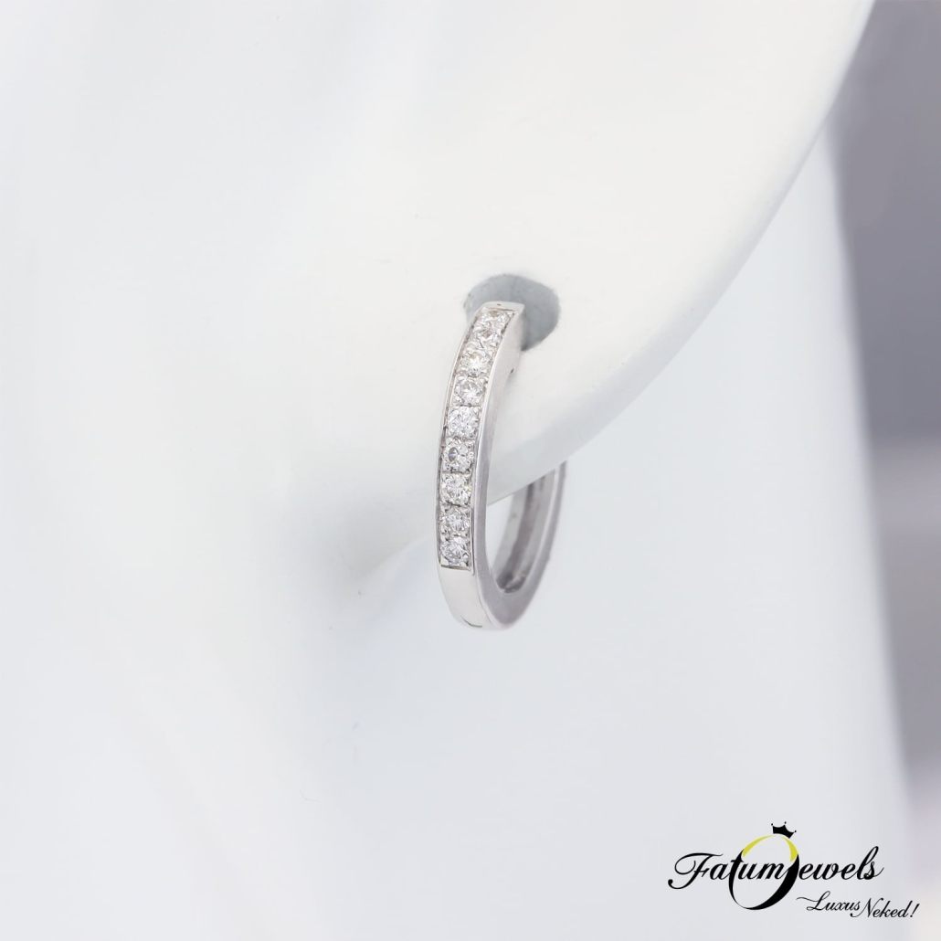 Kedveled az alliance gyűrű formai kialakítását? Akkor ez a Te fülbevalód. Olyan látványt nyújt ez az ékszer, mintha dupla alliance gyűrű került volna a füledbe. Kilenc-kilenc briliáns gyémánt süllyesztett kialakítással fehérarany foglalatban ahogy a Fatumjewels Galéria megálmodta számodra. Ragyogj kedvedre ezzel az egyedi gyémánt karika fülbevalóval.