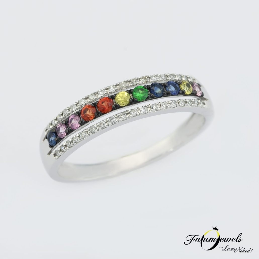 Színes, mint a természet. Színes, mint a szivárvány. A természet alkotta, a Fatumjewels Galéria sorba rendezte. Így készült el ez a gyémánt színes drágakő gyűrű, két gyémántsorral a szélén. Fejezd ki színes egyéniségedet egyedi Fatumjewels ékszerrel! Ez a fehérarany gyűrű akár jegygyűrű női párja is lehet, ha úgy szeretnéd.