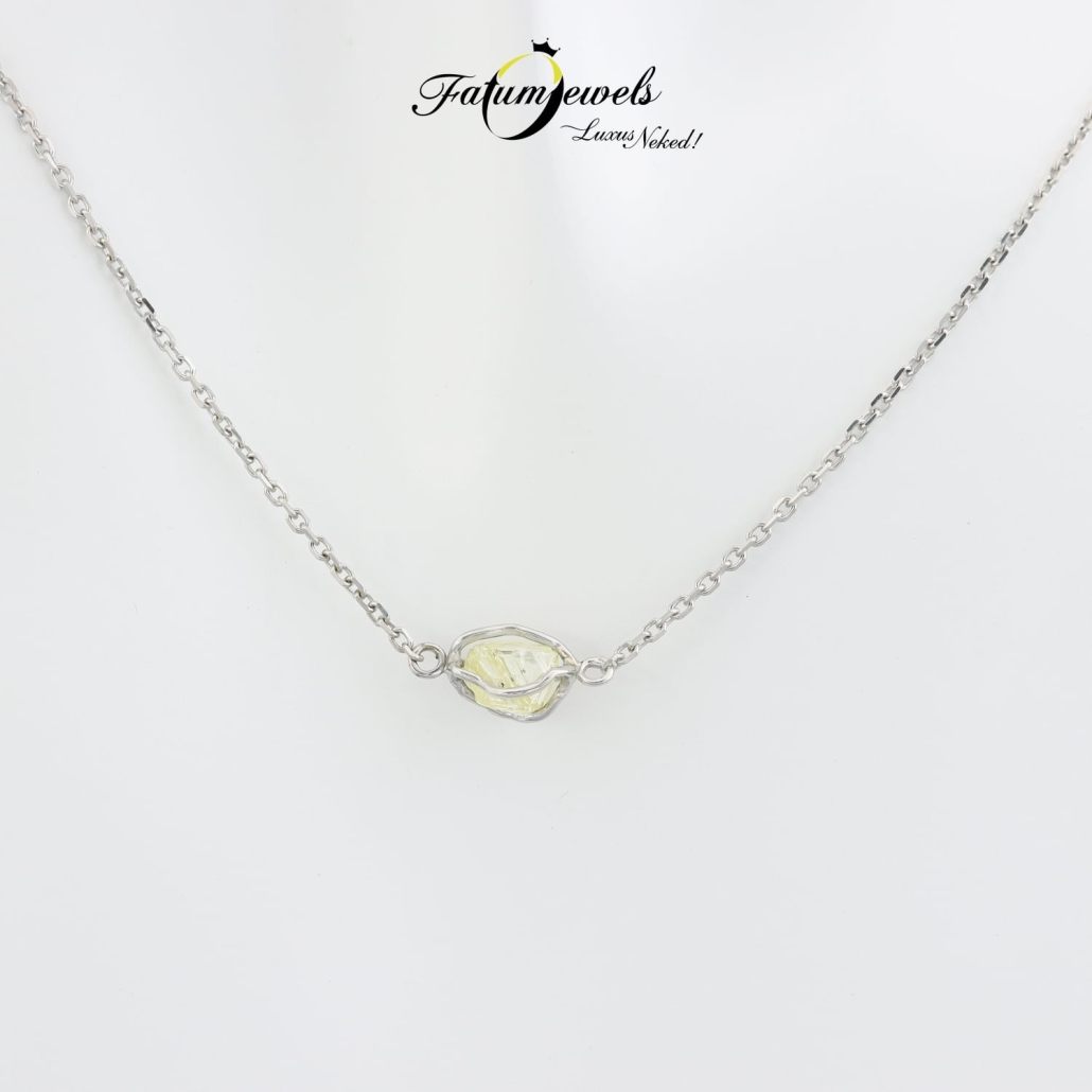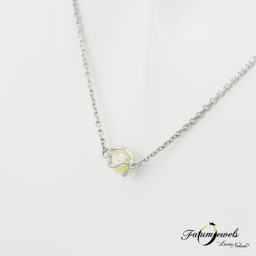 A finoman csiszolt fehérarany lánc gyönyörű kontrasztban áll a központi csiszolatlan sárga gyémánttal, amely ragyog és vonzza a tekintet. Ez a sárga gyémánt maga a természetes szépség, amely a csillogó láncon harmonikus kompozíciót alkot, és tökéletesen kiegészít minden elegáns öltözetet. Ez a fehérarany csiszolatlan sárga gyémánt nyaklánc tökéletes ajándék lehet annak, akit nagyon szeretsz, vagy akár saját magadat is meglepheted vele.