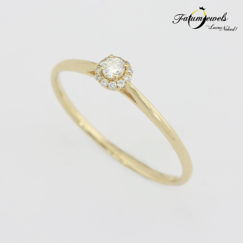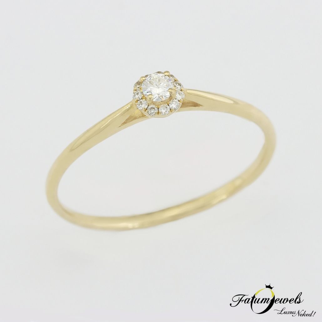Ugye, már számtalanszor elképzelted, ahogy a szerelmed ujjára húzod az eljegyzési gyűrűt, miután remegő térdekkel megkérted a kezét, ő pedig remegő ajkakkal, szemeiben az öröm könnyeivel rebegte el az igent? Ha így van, és már csak a tökéletes gyűrű hiányzik ehhez a tökéletes pillanathoz, akkor vess egy pillantást erre a gyönyörű arany eljegyzési gyűrűre! A központi gyémántot, amely lehet akár a sírig tartó közös életetek szimbóluma, apró gyémántok övezik, mint a rengeteg örömteli pillanat, amelyet eddig megéltetek közösen, és elvezetett idáig: a közös életetek kapujába. Lépjetek be ezen a kapun, és várjon rátok mögötte is olyan sokáig tartó boldogság, amíg a gyémántok ragyognak ebben a gyűrűben!