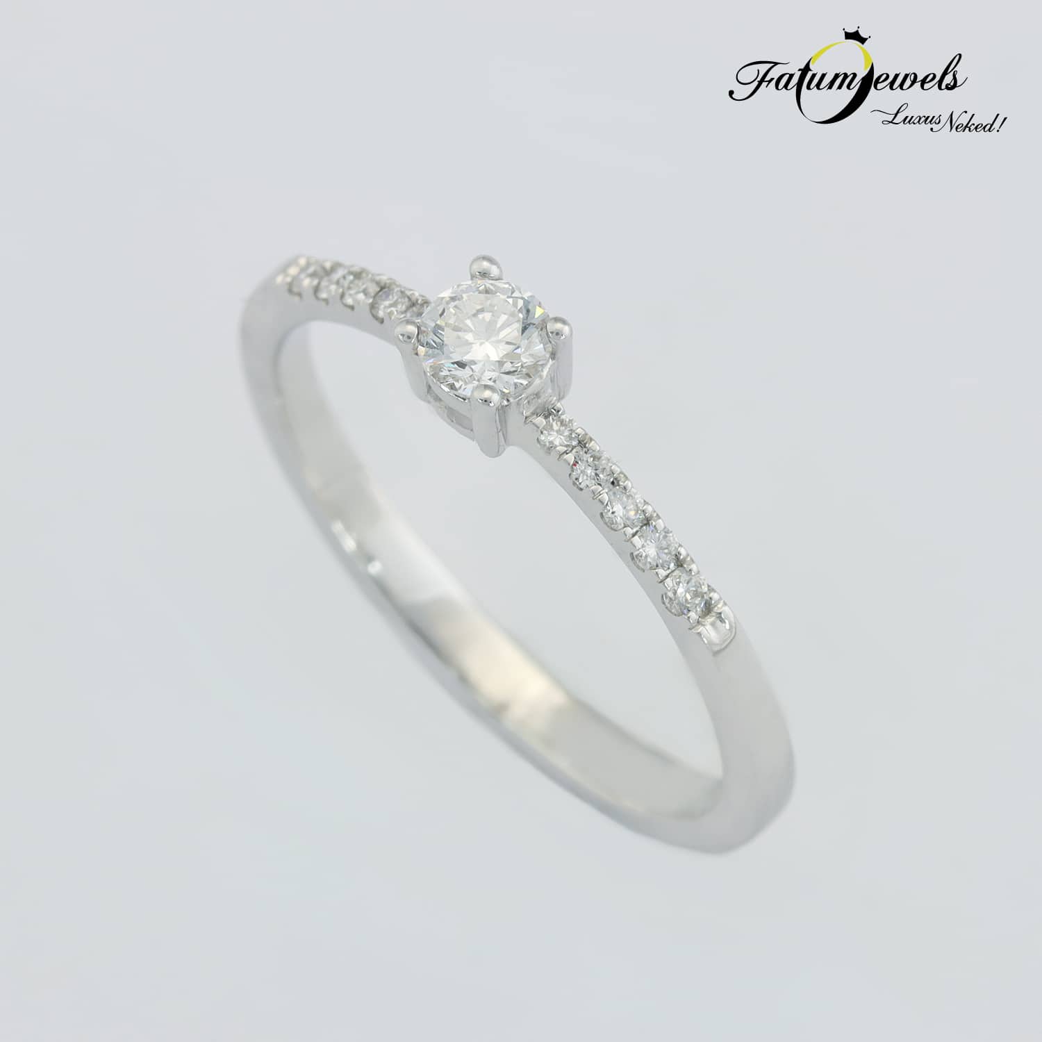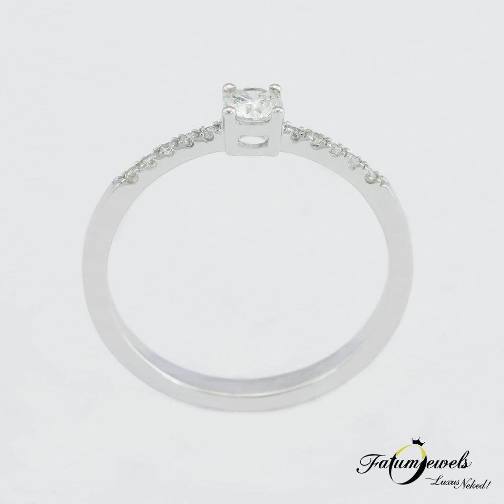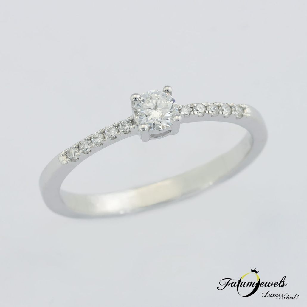 A lánykérés egy olyan szituáció, amikor annak is elszorulhat a torka, aki egyébként a szavak embere. Ez a gyönyörűen csillogó fehérarany eljegyzési gyémántgyűrű biztosan segíteni fog feltenni a nagy kérdést ebben a különleges pillanatban. A karcsú és elegáns kialakítású gyűrű felső íve finoman és precízen csiszolt apró gyémántokkal díszített, amelyek ragyogása még inkább felhívja a figyelmet a központi gyémánt szépségére, a fehérarany fénye pedig tovább emeli ennek a drágakő kompozíciónak könnyed eleganciáját. Igazi mestermű, az egyszerű szépség kedvelőinek ajánlva.