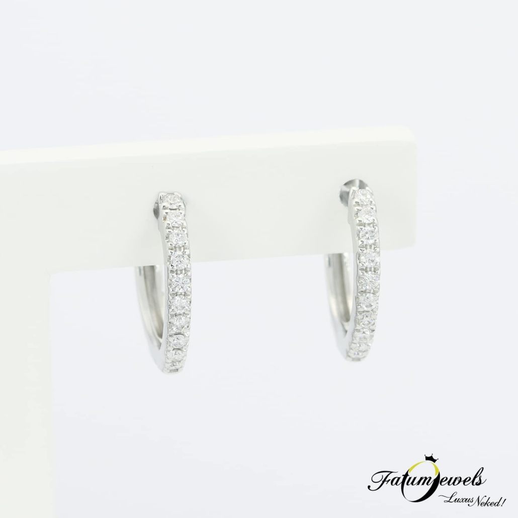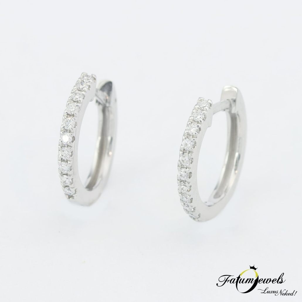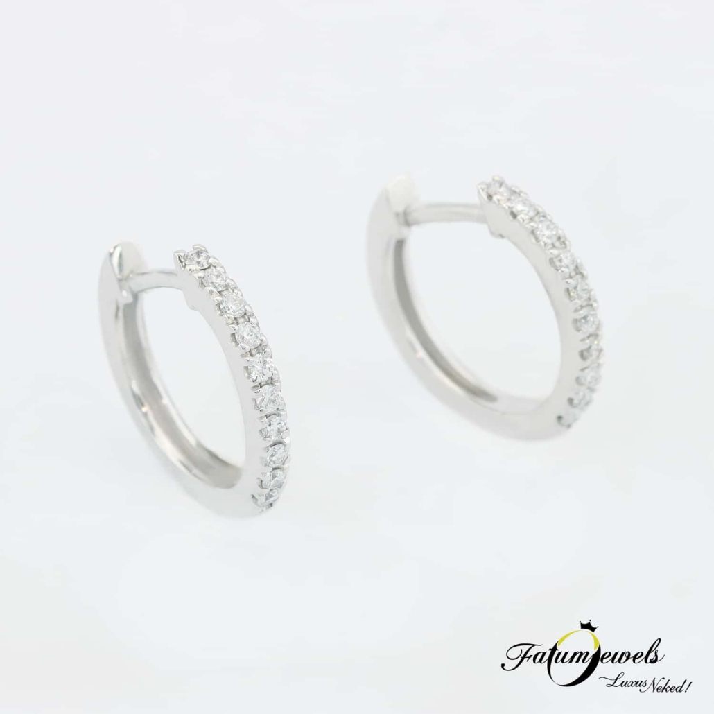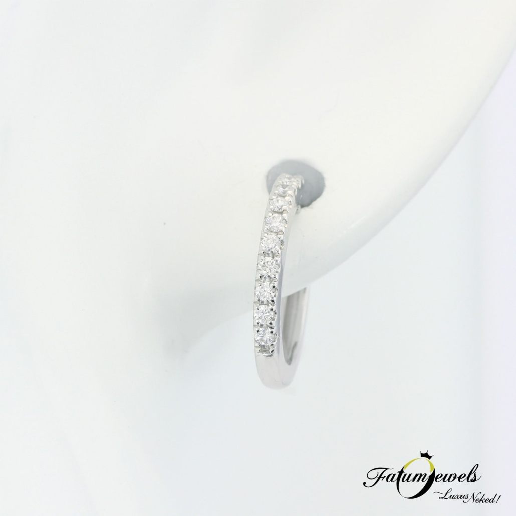 Fehérarany foglalat oltalmazza a briliáns csiszolású gyémánt drágaköveket ennek a Fatumjewels fülbevalónak a díszeként. Az ékszer egyszerre visszafogott és figyelemfelkeltő. A fülbevaló formája letisztult, a gyémántok színe olyan tökéletes, hogy azonnal észrevehető bármilyen környezetben. Gyémánt fülbevaló igen kedvező áron a Fatumjewels Galéria fülbevaló kínálatában.
