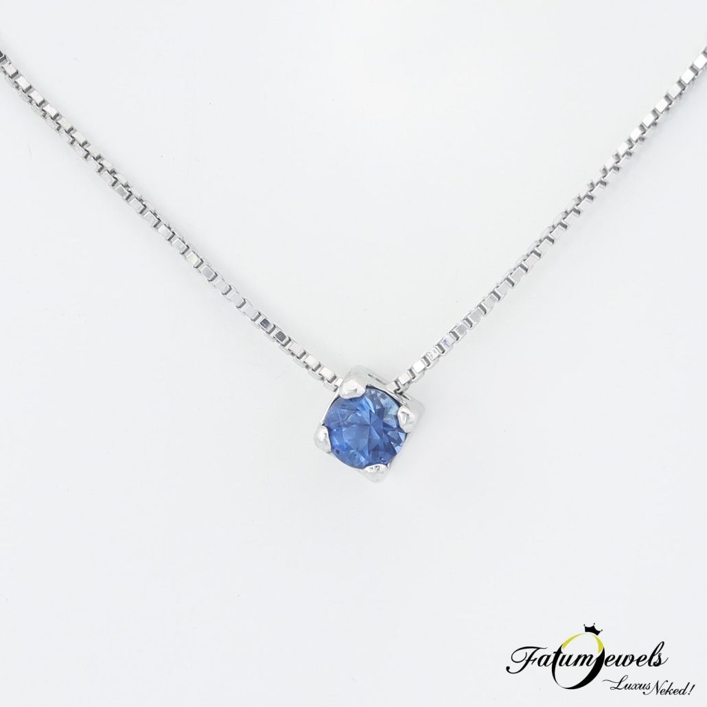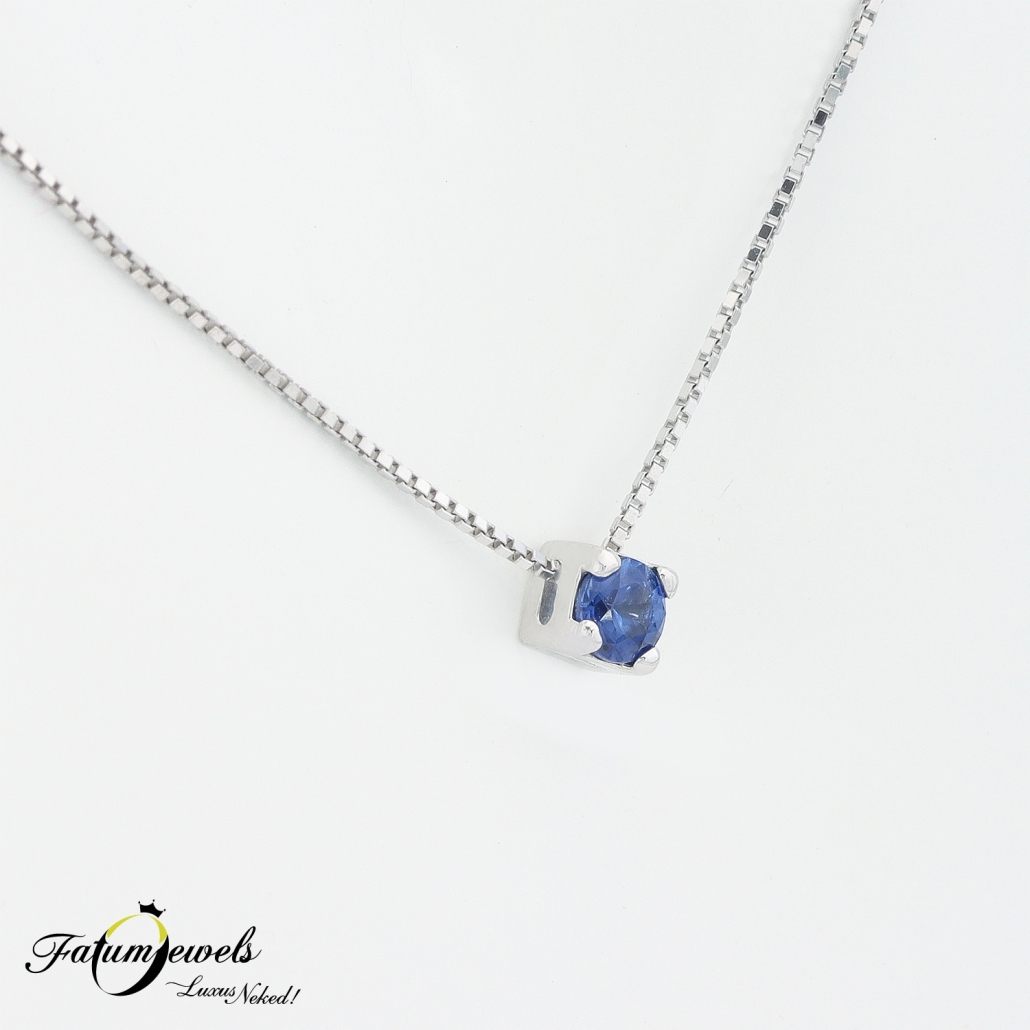 Élére állított szögletes fehérarany foglalat tartja a kerek csiszolású kék zafírt. A Fatumjewels Galéria olyan hölgyek számára tervezte ezt a zafír medált, akik ezáltal szeretnék kifejezni modern hozzáállásukat az élethez. Egy ékszer roppant kifejező lehet, ahogy ezt láthatjuk ennek a medálnak az esetében is. Fatumjewels fehérarany kék zafír medál lánccal.