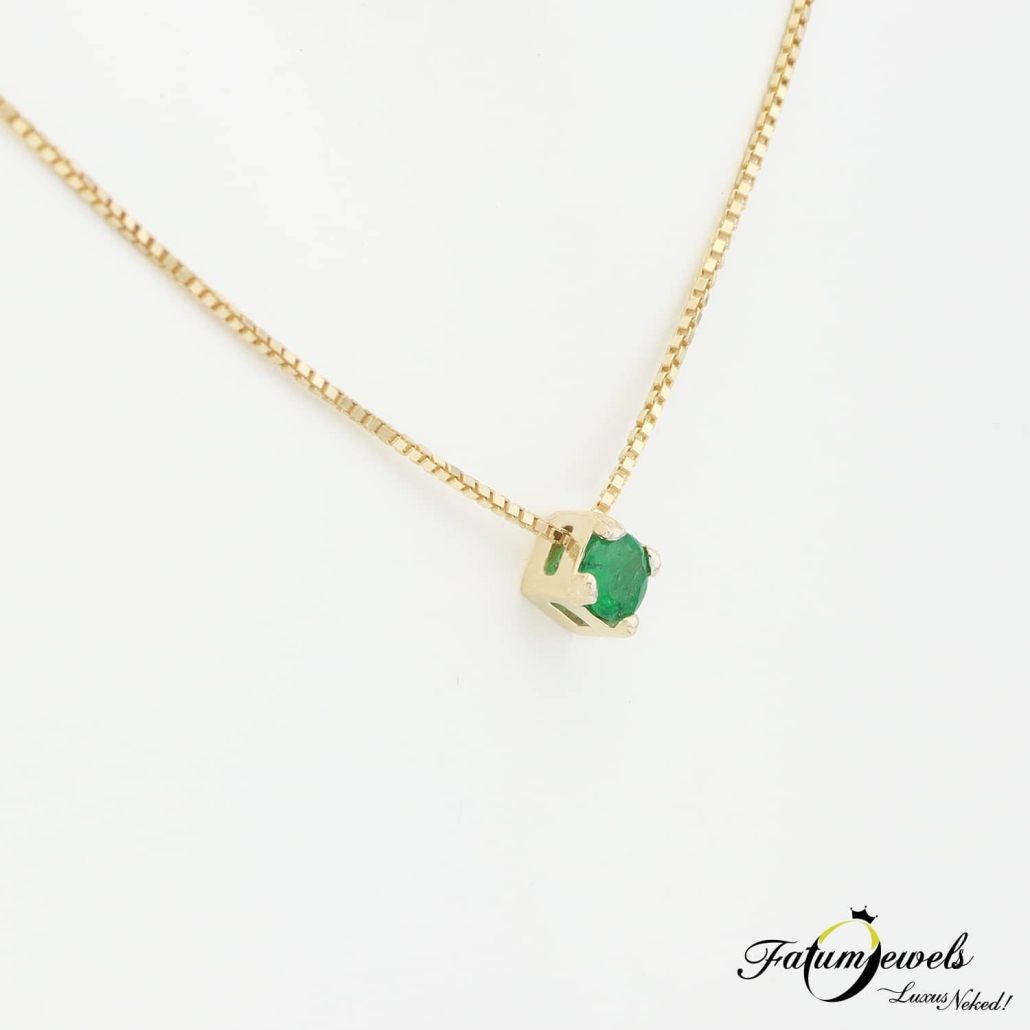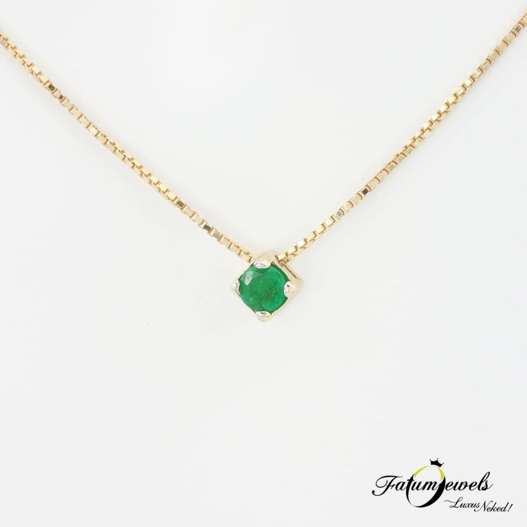 Egyszerű vonalvezetésű, letisztult, minimalista sárga arany smaragd medál lánccal a Fatumjewels Galéria tervezésében elérhető áron. A medál dísze a 0,20 karát smaragd, mely négyzet alakú négy karmos foglalatot kapott. A négyzetes formavilág a lánc szemeiben is visszaköszön. Kedves, visszafogott hölgyek számára tökéletes választás a mindennapokra, ám születésnapra, évfordulóra is tökéletes ajándék.